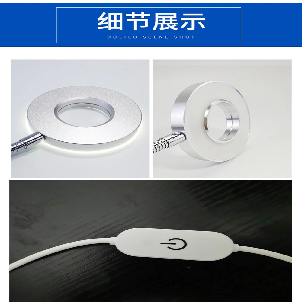 Тип источника: светодиодный светильник Напряжение: 5v Мощность: 5 Вт Световой поток: 500lm Цветовая температура: теплый светильник s + белый светильник + Естественный светильник Материал корпуса: алюминий Мощность Блок питания: usb Угол освещения 120 градусов Тип переключателя: сенсорная кнопка Область применения: Исследование красоты макияж Срок службы: 50000h Характеристики: 3 цветовых температуры