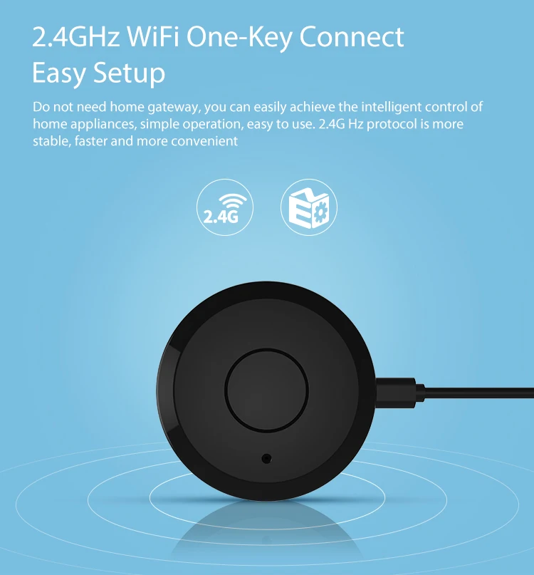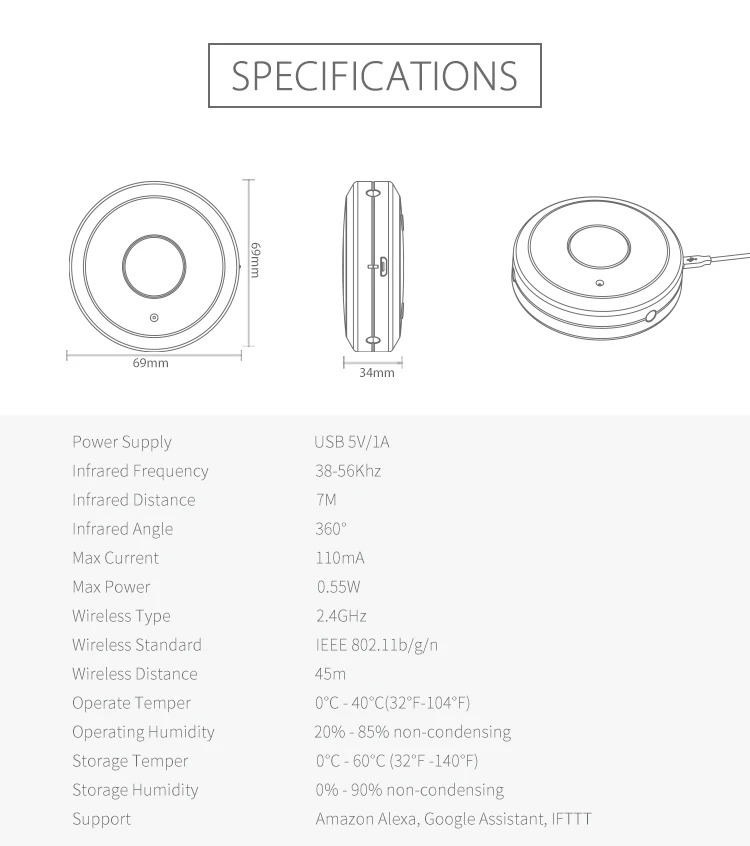-- Название продукта: универсальный пульт дистанционного управления Wi-Fi-IR -- Входная мощность: 5 В постоянного тока/1 А -- ИК-частота: 38-56 кГц -Покрытие диапазона: 360 ° -- Максимальный ток: мА -- Максимальная мощность: 0,55 Вт -Стандарт беспроводной связи: Wi-Fi 2,4G 802,11 b/g/n -- Режим управления: мобильное приложение «Tuya/SmartLife» -Поддержка приложений: Android/iOS -- Материал: ПК/АБС -- Размер изделия: 68*68*22 мм (Д * Ш * В) -- Вес изделия: 33 г/1,2 унции