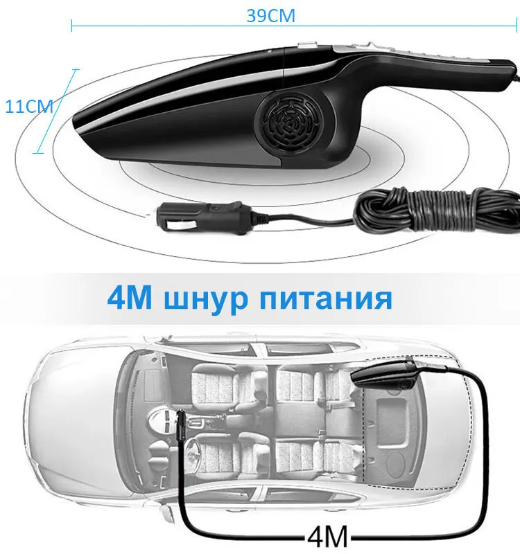 Название: автомобильный пылесос Цвет: черный, оранжевый, белый Размер: 36*10*13 см/14,17*5,11*3,93 дюйма Длина шнура питания: 4 м Источник питания: автомобильный прикуриватель Совместим с: автомобилем, домом (требуется адаптер от 220 до 12 В) Напряжение: 12 В Мощность: 120 Вт Вес изделия: 0,73 кг Как использовать? 1. Вставьте разъем прикуривателя в отверстие прикуривателя в автомобиле 2. Включите кнопку 3. Используйте различные насадки в зависимости от различных случаев 4. Этот продукт является влажным и сухим пылесосом. Обратите внимание, чтобы открыть переднюю крышку для слива воды при поглощении воды. 5. Работает только с: 12 В, не 24 В