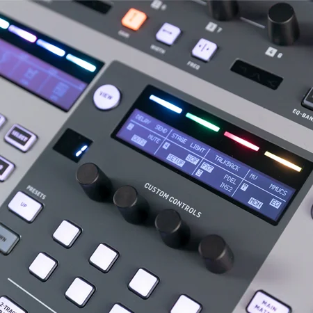 Центральный раздел предлагает настраиваемые пользователем элементы управления, т. Е. 4 поворотных кодера и 20 кнопок с 2 LCDs. Вы всегда решаете, какие функции вы хотели бы иметь в пределах вашей досягаемости. Большое роторное колесо обеспечивает точную регулировку до 8 параметров пользователя или используется для дистанционного управления DAW через USB MIDI. Конфигурация управления также включает в себя предварительно определенные функции для USB и устройство записи на карты SD транспорта, шоу управления и отключения звука групп.