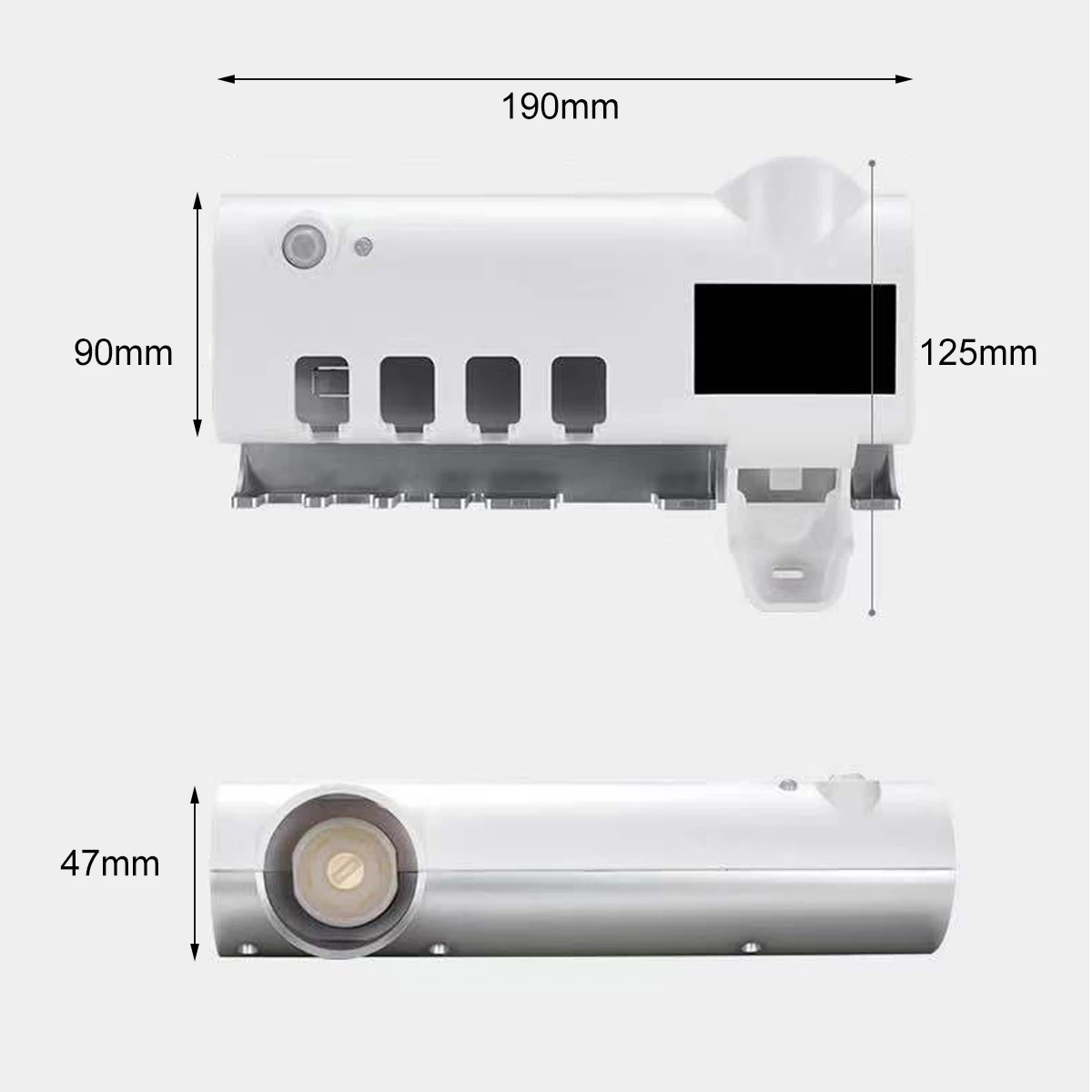 Feature *3-in-1 function Including toothbrush Holder , toothpaste Dispenser, toothbrush UV sterilizer. Toothbrush Holder Can storage up to 4 pcs toothbrushes included electric toothbrush head, each toothbrush head is protected Interval plate, more safe and health, keep wash basin neat. Toothpaste Dispenser quantitative design saves toothpaste, protect toothbrush from cross infection. *Family design can store up to 4 toothbrushes. *UV light will auto-off after 4-5 minutes. infection. *Ultraviolet-ray sterilization Plug in the-power, the switch to turn on the automatic disinfection state automatically stop the sterilization rate of 99.9% in 4-6 minutes. *Sticker Design Built-in a sticker, perfect for smooth surface, such as glass, ceramic, marble, must clean the surface before you stick. You should hangs toothbrush disinfection after squeeze-air and glue dry Specifications: Color: White Material: plastic Output: DC 5V 450mA Working voltage: DC3.7V Working Current: 150 mA Battery capacity:2600mAh Working Environment: 5-50 Selsius Size: 19*12.5*9cm/7.48*4.92*3.54'' Package: 1*Toothbrush UV Sterilizer 1*Sticker 1*USB Charging Cable 1*User Manual 1*toothbrush 1*Package Box