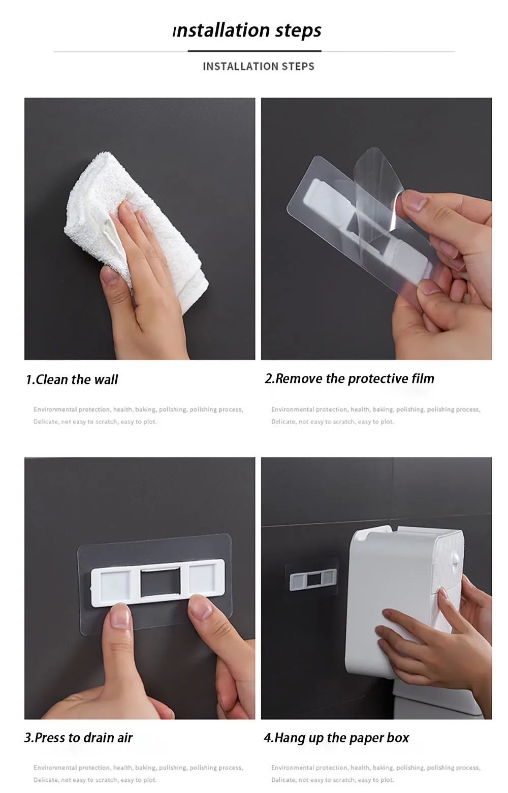 Характеристики: 1. Настенный, не требует сверления, прост в установке. Сильная несущая способность; Поставляется с самоклеющейся наклейкой. 2. Большое практическое значение и хорошо сделано с хорошей поверхностью. Удобный и стильный. 3. Несколько способов использования, многосценарное использование 4. Плоский дизайн, идеально подходит для хранения мыла, мобильный телефон или другие предметы. 5. Не легко выцветает, устойчив к коррозии, не ржавеет и легко моется. Параметры Материал: АБС-пластик, Размеры: 22*20,5*12,5 см Цвет: белый инструкции 1. Протрите стены и держите их сухими 2. Оторвите бесследную защитную наклейку 3. Поместите застежку на стену 4. Вытяните воздух от пряжки 5. Положите коробку для салфеток в список с застежкой, посылка-1 шт. коробка для туалетных салфеток
