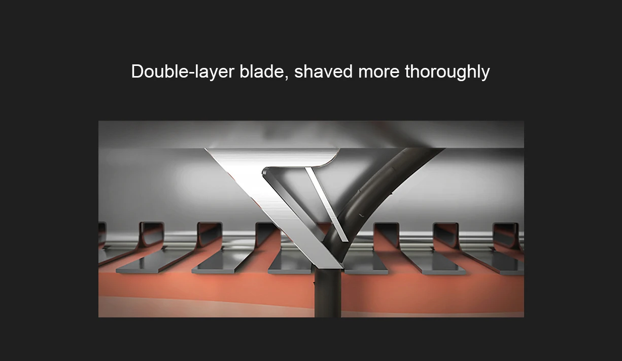 Борода мягко сгибается и растет в разных направлениях, а сама сеть ножей имеет определенную толщину, которая легко оставляет щетину. Используя Двухслойное лезвие, вспомогательный нож сначала приподнимает бороду, а главный нож затем быстро режет бороду и выбивает ее более тщательно.