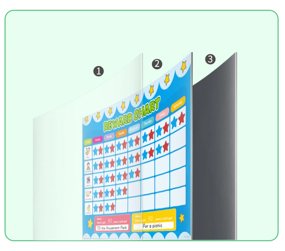 1.UCMD Таблица наград: используется в течение 30 дней, легко протирать-специальная сухая стирающая ПЭТ пленка 2. Другие конкуренты: используется только в течение 1 недели, затем протирается с помощью прилагаемого ластика
