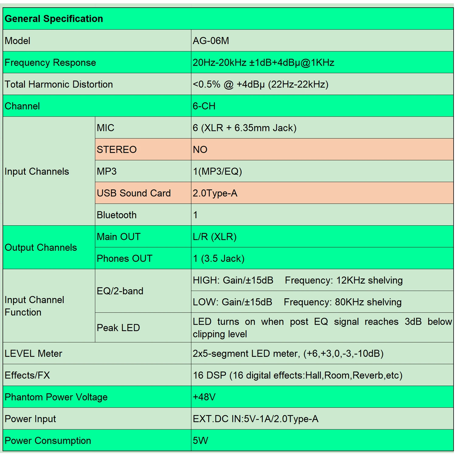 Особенности1. 6 входных микшер каналов.2. + 48V фантомное питание.3. 16 цифровой эффект DSP.Встроенный DSP, можно сделать с 16 цифровыми efects (зал, комната, реверберация и т. Д.)4. USB MP3 Play со встроенным эквалайзером, USB stick record.1) Встроенный MP3-плеер для воспроизведения музыки в нескольких форматах и записи, светодиодный дисплей