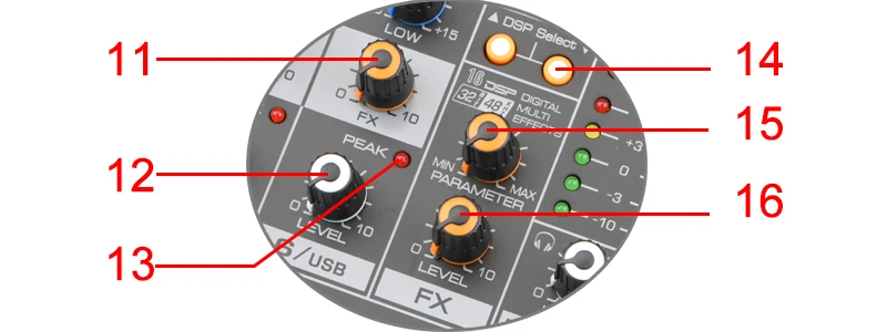 11. [FX] Контроллер1) Отрегулируйте уровень сигнала от канала к линии реверберации.2) обратите внимание, что уровень сигнала будет отличаться в зависимости от настроек аттенюатора канала.3) при использовании стерео канала, будут смешивать сигналы от L и R каналов, затем, отправить его на линии реверберации.12. [Уровень] контроллерНастройте, чтобы сбалансировать громкость каждого канала.13. [Пик] светодиодный светильник1) Когда громкость входного сигнала или громкости после регулировки эквалайзера слишком высока, светодиодный светильник индикатора будет мигать,2) Поверните ТРОЛЛЕР против часовой стрелки, чтобы уменьшить громкость.14. [Выбор DSP]Можно сделать с цифровыми эффектами (зал, комната, реверберация и т. Д. См. Список эффектов на поверхности смесителя). Или сделайте задержку только с 16 регулировкой уровня.15. [Контроль параметров, если сделать с цифровыми эффектами]Используется для регулировки глубины выбранного эффекта, скорости и т. д.