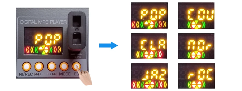 3. Клавиша управления эквалайзеромЕсть 6 видов звуковых эффектов. (Нормальный/Рок/Поп/классический/Джаз/кантри)