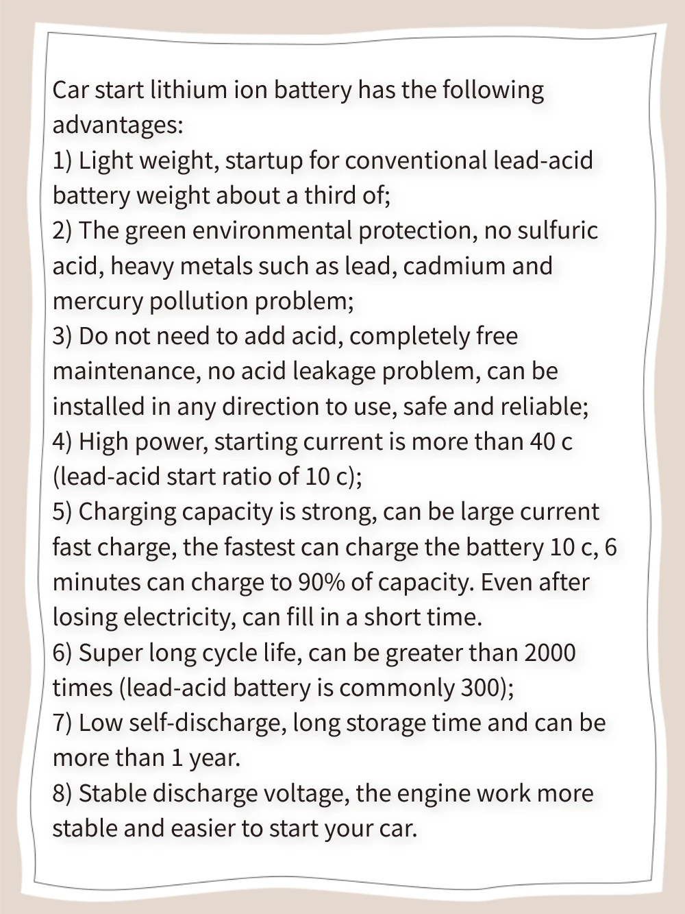 Преимущества: он имеет отличную безопасность и высокую эффективность и стабильность производительности, чем традиционные свинцово-кислотные батареи Вес светильника: светильник в 1/3 раза больше, чем свинцово-кислотный аккумулятор. Низкий уровень саморазряда: он может храниться более 1 года (и нормальная свинцовая кислота может храниться только менее 6 месяцев). Отсутствие загрязнения: он не содержит каких-либо опасных материалов, таких как тяжелые металлы, кислоты или любые провода и т. Д. Отличная большая производительность зарядки: он может принимать ток зарядки 10C и 90% будет заряжаться за 6 минут. Экономия топлива: увеличение входного напряжения, повышение эффективности свечей зажигания, что позволяет экономить топливо для ваших автомобилей Длительный срок службы: как правило, срок службы нашей батареи может достигать более 2000 раз с емкостью 80% (свинцово-кислотная батарея noral имеет срок службы всего в 300 раз). Внимание: перед установкой проверьте правильность выпрямителя. Литиево-ионный аккумулятор для мотоцикла имеет следующие преимущества: 1) Вес светильника, запуск для обычных свинцово-кислотных аккумуляторов примерно на одну третью часть; 2) Экологическая защита, отсутствие серной кислоты, тяжелых металлов, таких как свинец, кадмий и ртутное загрязнение; 3) не нужно добавлять кислоту, полностью бесплатное обслуживание, отсутствие проблемы с утечкой кислоты, может быть установлен в любом направлении для использования, безопасный и надежный; 4) Высокая мощность, пусковой ток составляет более 40 с (отношение начала свинцово-кислотного пуска 10 с); 5) ЗАРЯДНАЯ способность сильна, может быть большой ток быстрой зарядки, самый быстрый может зарядить аккумулятор 10 с, 6 минут можно зарядить до 90% емкости. Даже после потери электричества, можно заполнить в течение короткого времени. 6) сверхдлительный срок службы, может быть больше 2000 раз (свинцово-кислотная батарея обычно 300); 7) Низкий саморазряд, длительное время хранения и может быть более 1 года. 8) стабильное напряжение разряда, двигатель работает более стабильно и проще, чтобы начать ваш мотоцикл.