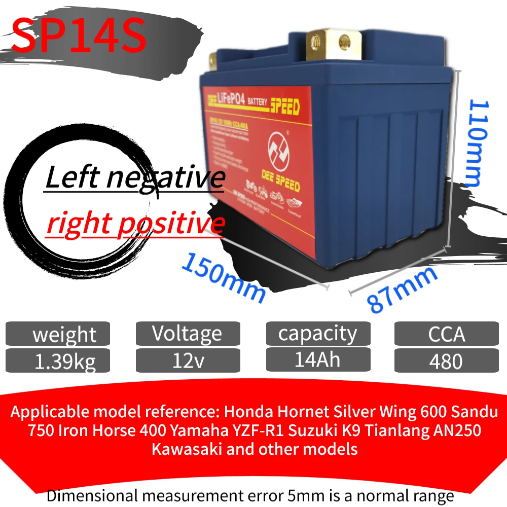 Номер модели: SP14S Емкость: 14 Ач CCA: 430A Максимальное напряжение защиты: 14,6 в Конечное напряжение: 8 в Размер: 150*87*110 мм Вес: 1,34 кг Сертификат: CE ROHS MSDS UN38.3 Высококачественные детали/аксессуары: класс А Плата защиты напряжения: Да Срок службы: более 2000 раз Использование для: R1 S1000RR HP4 CBR1000RR DJEBEL250 KLX450 WR450F WR250 XT225 TTR230 CB400SS XR400 PS250 VTR250 250 CB230 XR230 CBR150 PCX125 и т. Д. Направление положительного и отрицательного электрода: L отрицательное положительное оставлено отрицательное и правое положительное, L положительное отрицательное оставлено положительное и правое отрицательное Посылка включает в себя: 1. Одна батарея стартера скорости ди 2. Одно специализированное зарядное устройство