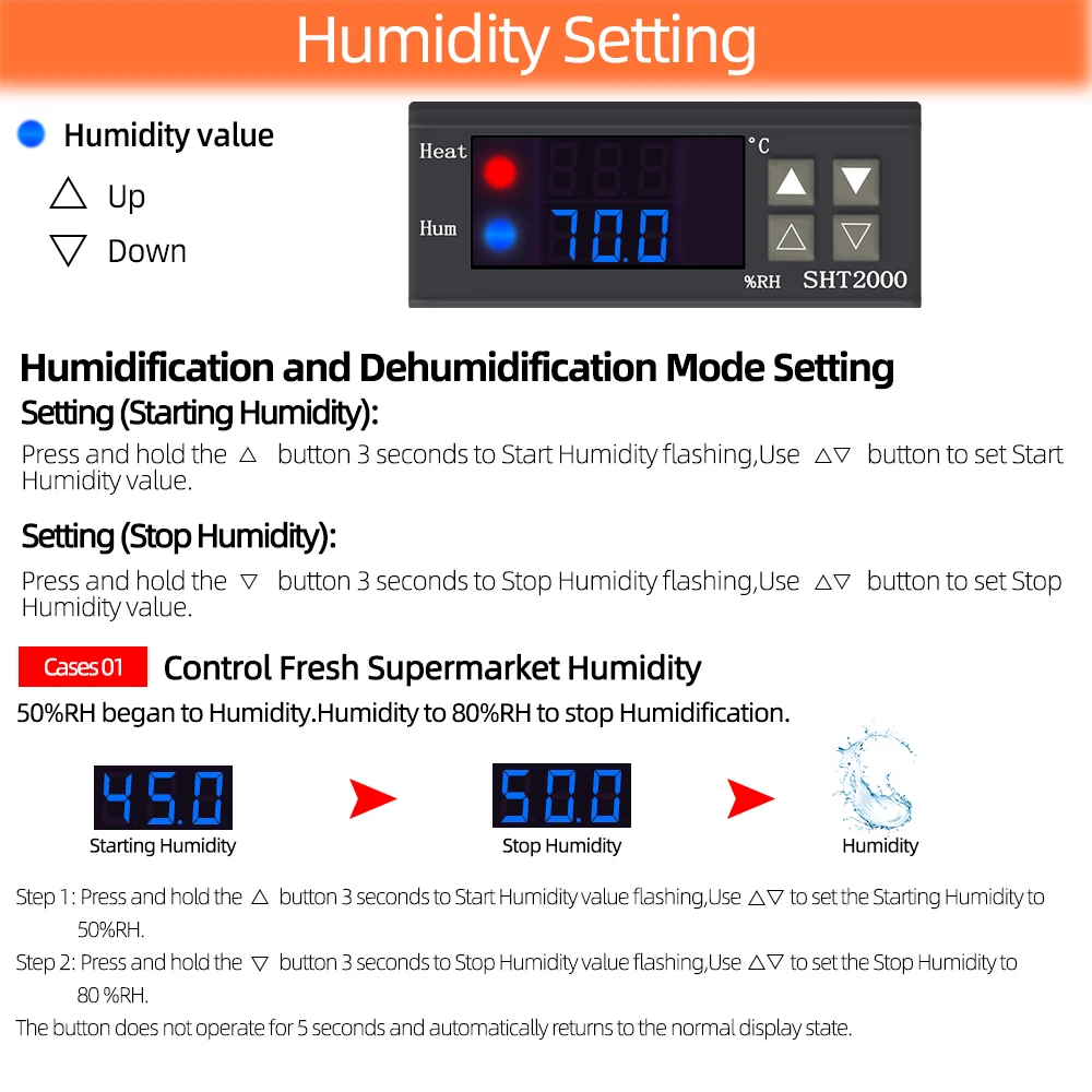Пример увлажнения: увлажнение свежего супермаркета, контроль увлажнения 50% RH начали увлажнять, увлажнение до 80% RH, чтобы остановить увлажнение.
