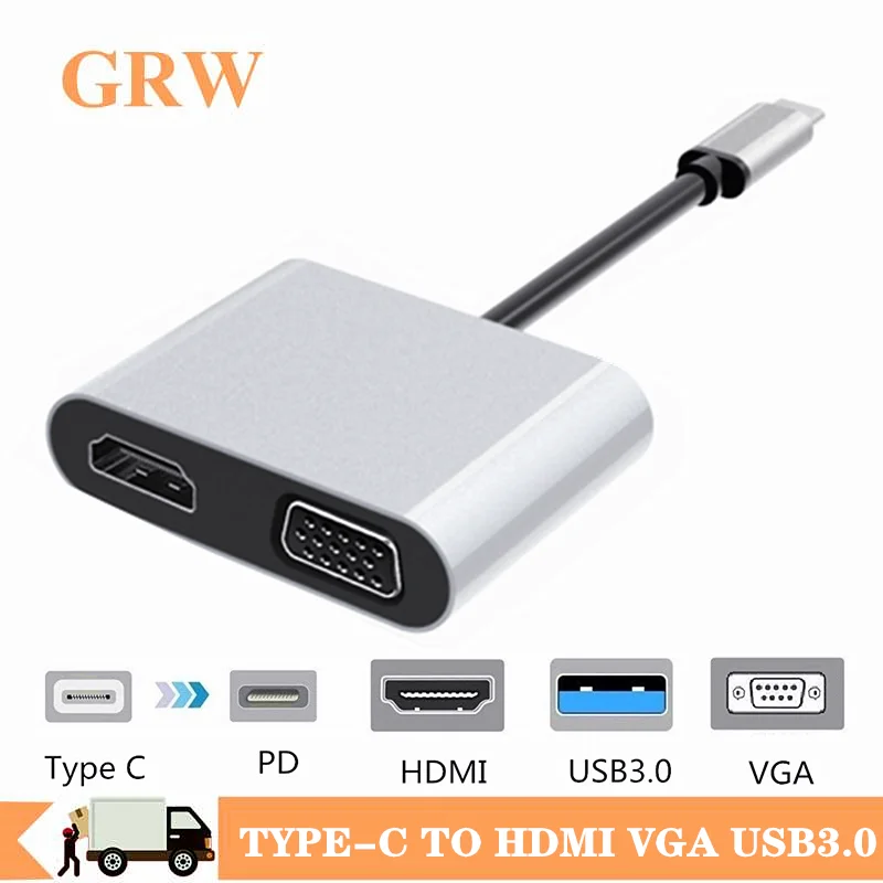 Описание: Название: аудио-видео адаптер Функция: USB C 4 в одном конвертере Цвет: серый Материал: алюминиевый сплав 4 в 1: длина линии: 15 см интерфейс: Тип C 3,1 на HDMI + VGA + PD + USB3.0 Параметр: USB: USB3.0 HDMI: 4K VGA: 1080P PD: 87 Вт вход питания Упаковочный лист: адаптер * 1