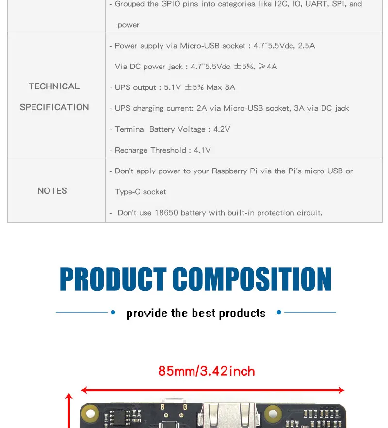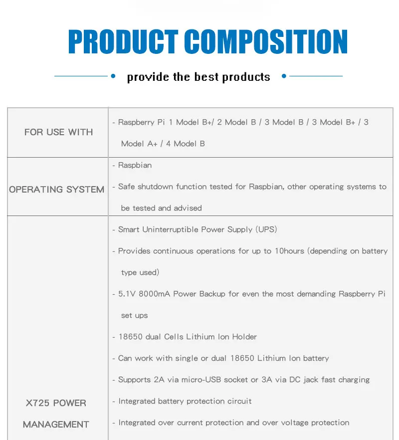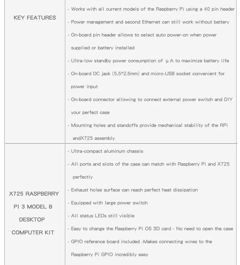 Обзор продукта В X725 представляет собой многофункциональный Плата расширения для всех текущих моделей Raspberry Pi с помощью 40 штыревой разъём. Он обеспечивает интеллектуальное и безопасное управление питанием, Удаленное включение/Пробуждение в локальной сети, безопасное отключение и полную мощность через программное обеспечение, Расширенный источник бесперебойного питания и второй 10/100M быстрый Ethernet. В X725 оставляет за собой 40-штыревой разъём, что может быть сложены вместе с другими Raspberry Pi Аксессуары для досок для расширения приложений. X725 также может использоваться с X820, X825, X850, X855, X856, X828 (HDD/SSD Shield) для безопасного резервного копирования данных. Инструкции по безопасности и предупреждения · Вы должны прочитать эти инструкции безопасности и предупреждения перед зарядкой ваших батарей. · Литий-полимерные и литий-ионные аккумуляторы летучие. Если вы не ознакомились с приведенными ниже инструкциями, это может привести к пожару, нанесению телесных повреждений и повреждению собственности при неправильном заряде или использовании. · Никогда не совершайте неправильное полярное соединение при зарядке и разрядке аккумуляторов. Всегда проверяйте полярность разъема аккумулятора, чтобы убедиться, что «+» до «+» и «-» до «-». · Не смешивайте и не используйте старые батареи и новые батареи или аккумуляторы с различными брендами. · Литиевые батареи имеют срок службы, пожалуйста, замените старый аккумулятор на новый, когда он достигнет срока службы или когда ему будет два года, в зависимости от того, что будет первым. · При зарядке аккумуляторной батареи, пожалуйста, положите батарею в огнеупорный контейнер. Пожалуйста, не оставляйте X720 на деревянном материале или ковре и без присмотра. · Необходимо держать X720 вдали от детей.
