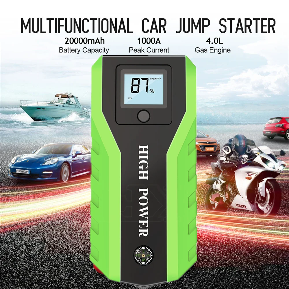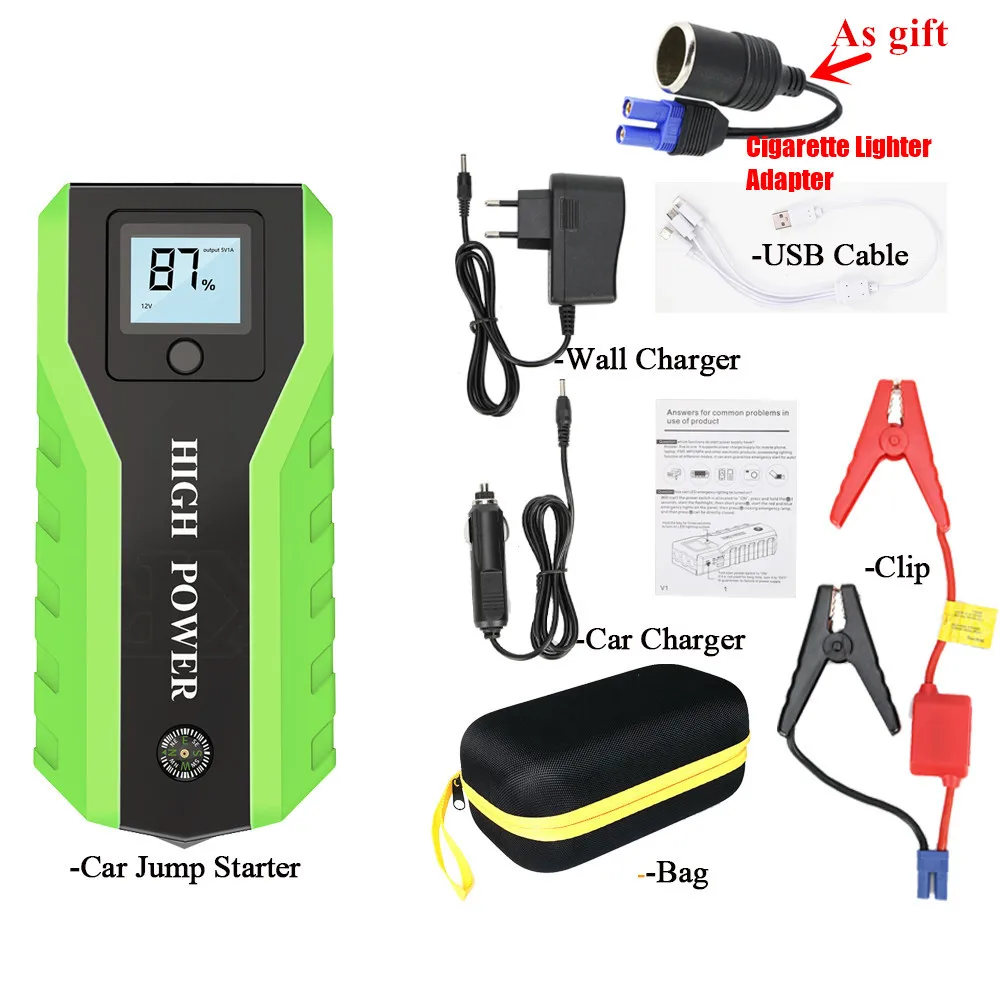 Стартер для автомобиля (внешний аккумулятор) * 1 Зажимы для аккумулятора (красный = Положительный; Черный = отрицательный) * 1 Настенное зарядное устройство * 1 Автомобильное зарядное устройство * 1 3 in1 зарядный кабель * 1 Инструкция на английском языке * 1 Чехол для розничного инструмента * 1 Адаптер прикуривателя в подарок * 1