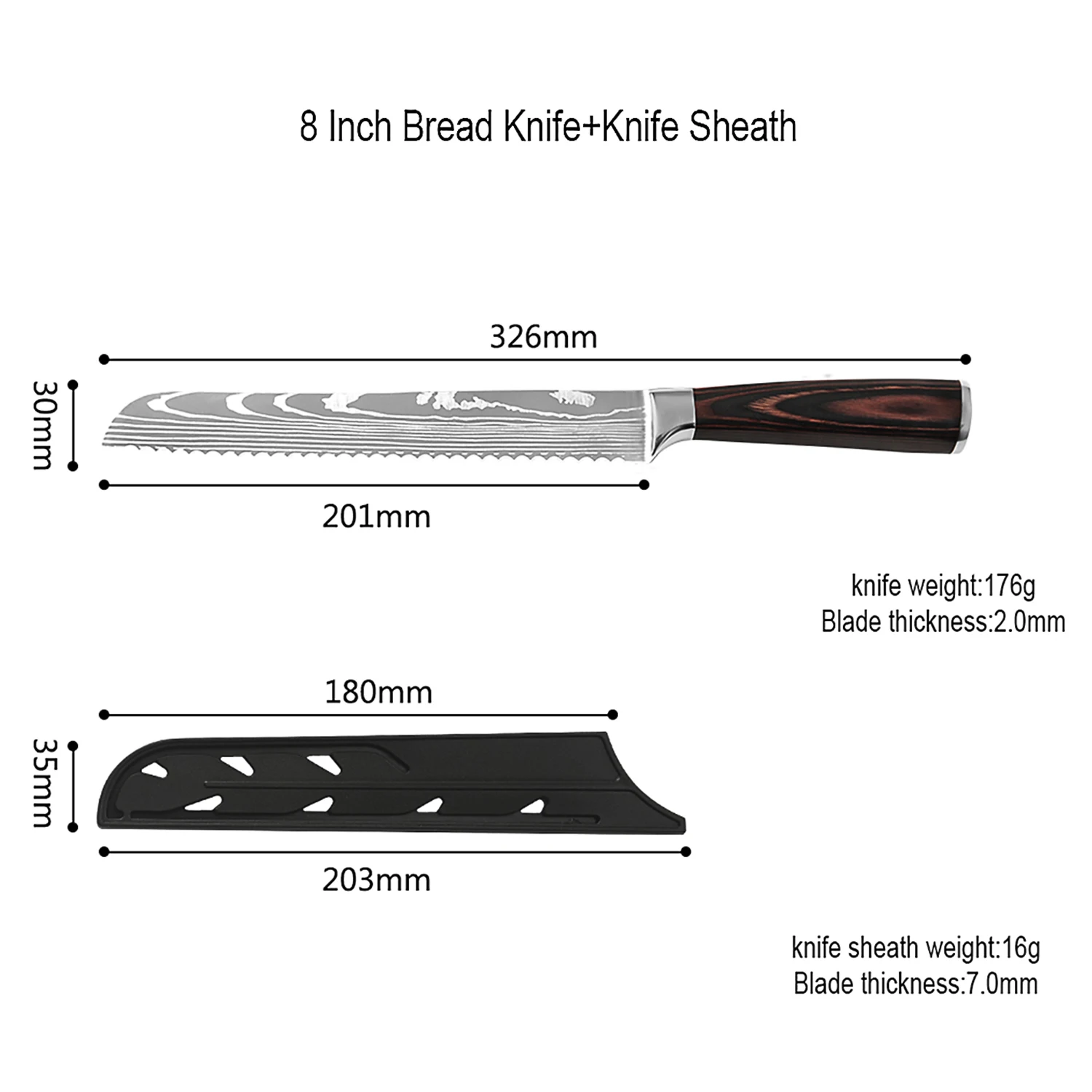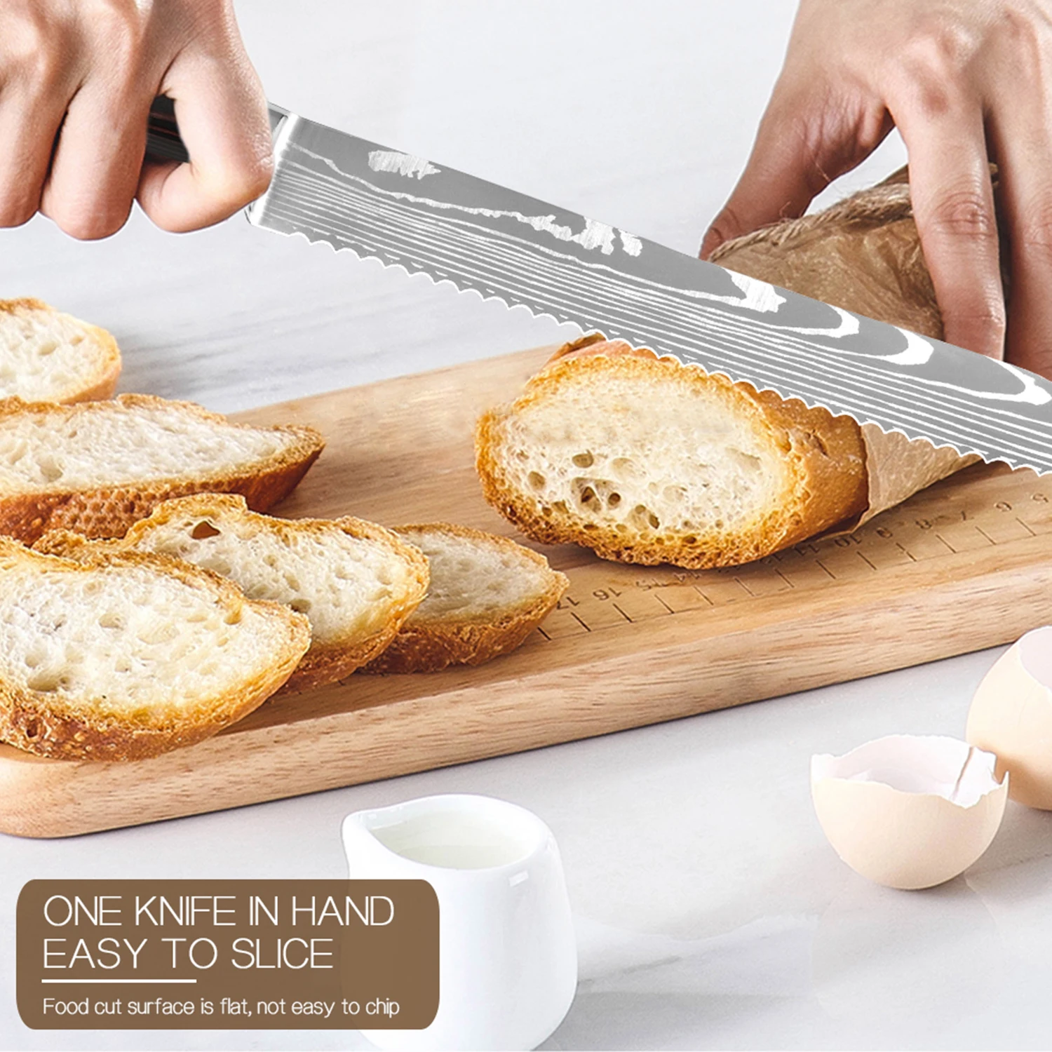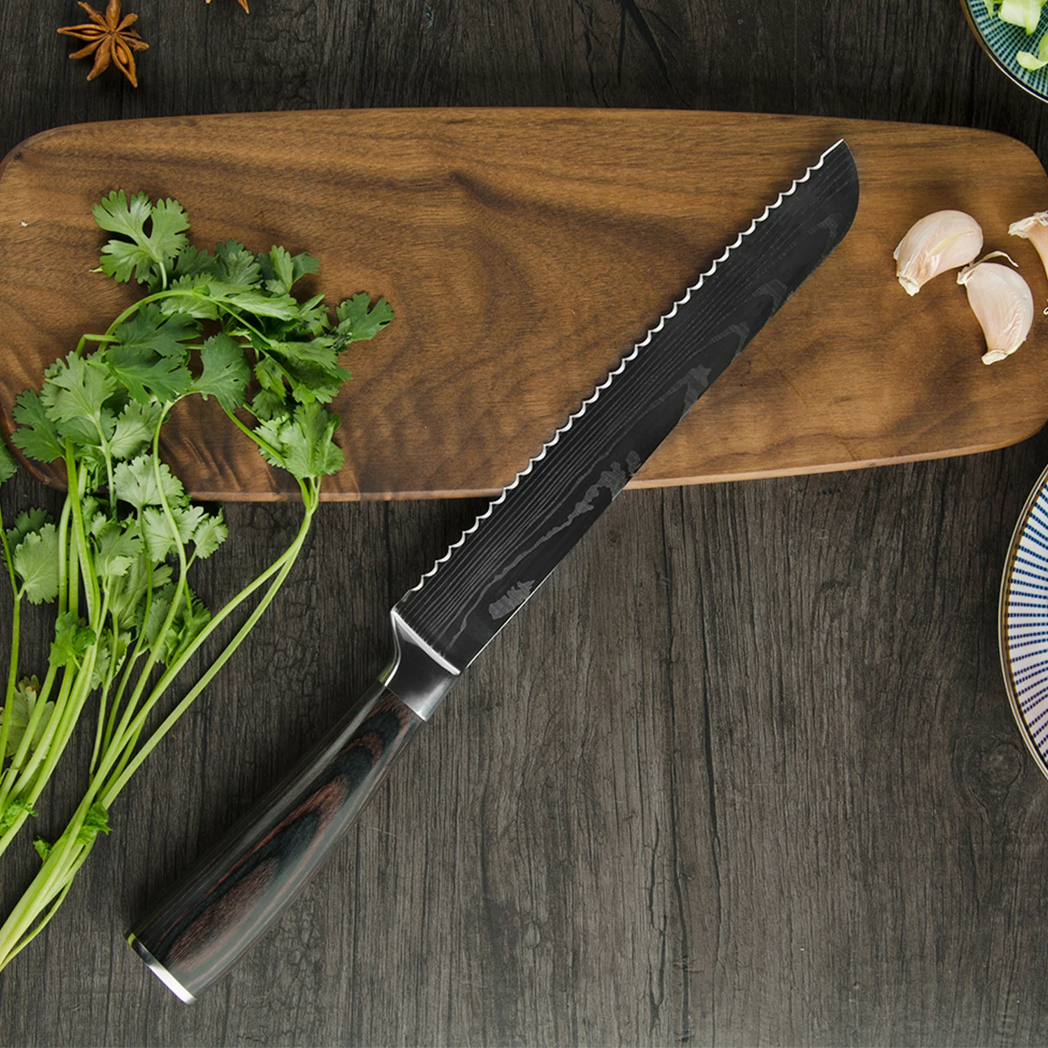 Ключ Feature1: Дамасская сталь с лазерным узором Ключ Feature2: Волнистый край, зубчатое лезвиеКлюч Feature3:Можно отрезать хлеб,Также можно нарезать пончики, пирожные, стейки, овощи и т. д.
