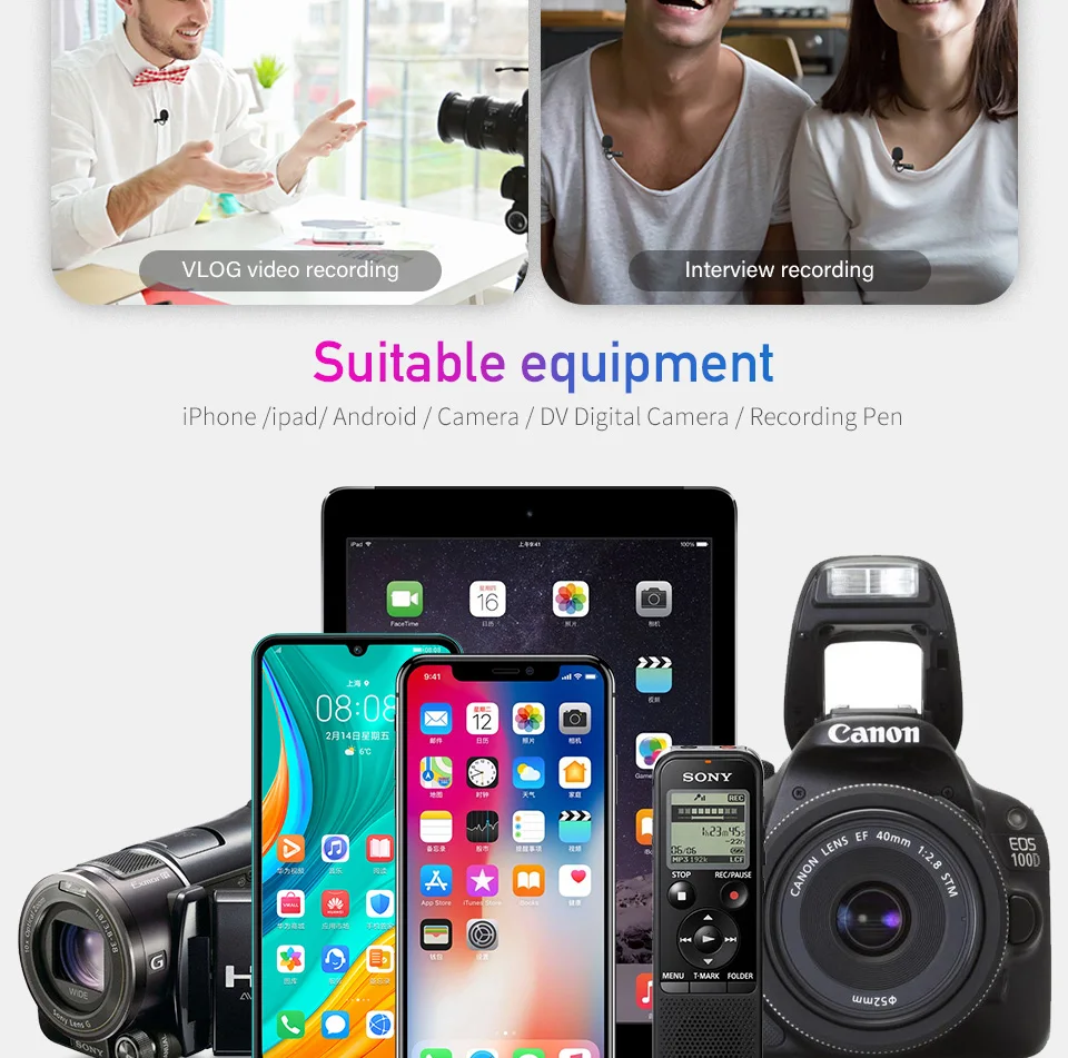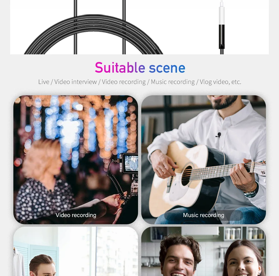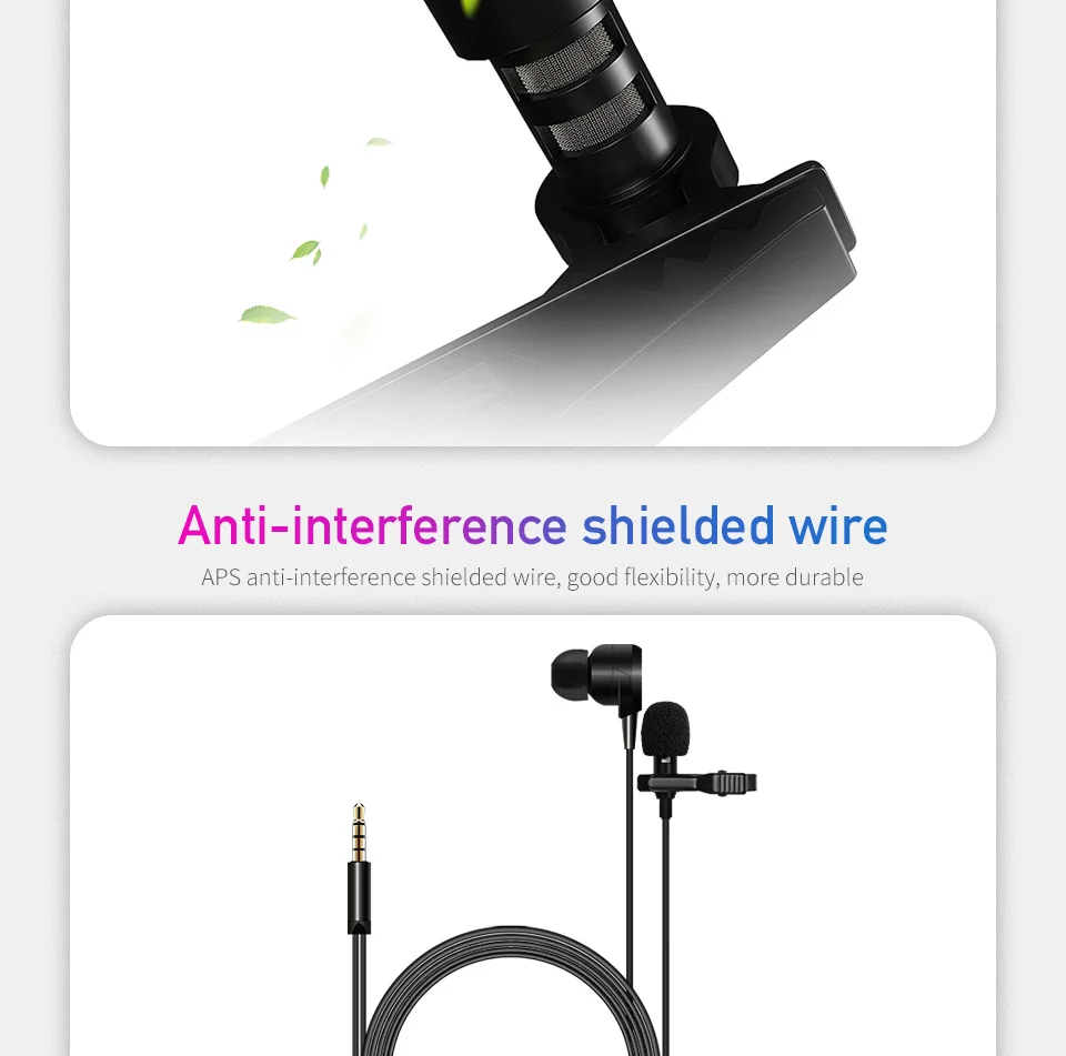 Свойства продукта: Размер головки микрофона: Φ6.0 × 2,2 мм Высокочувствительный сердечник микрофона с защитой от помех Чувствительность: -32 дБ ± 1 дБ Направленность: всенаправленный Сопротивление: ≤ 2,2kΩ Рабочее напряжение: 2,0 V Частотный диапазон: 100-16 кГц Отношение сигнал-шум: более 60 дБ Диаметр штекера: 3,5 мм Длина кабеля: 1,5 м Подходит для: Apple phone, Android phone, camera, video camera, computer, notebook Примечание: требуется подключение по Bluetooth для подключения Apple мобильный телефон, модель Bluetooth: Lightning, микрофон можно использовать после подключения