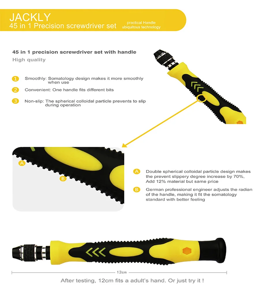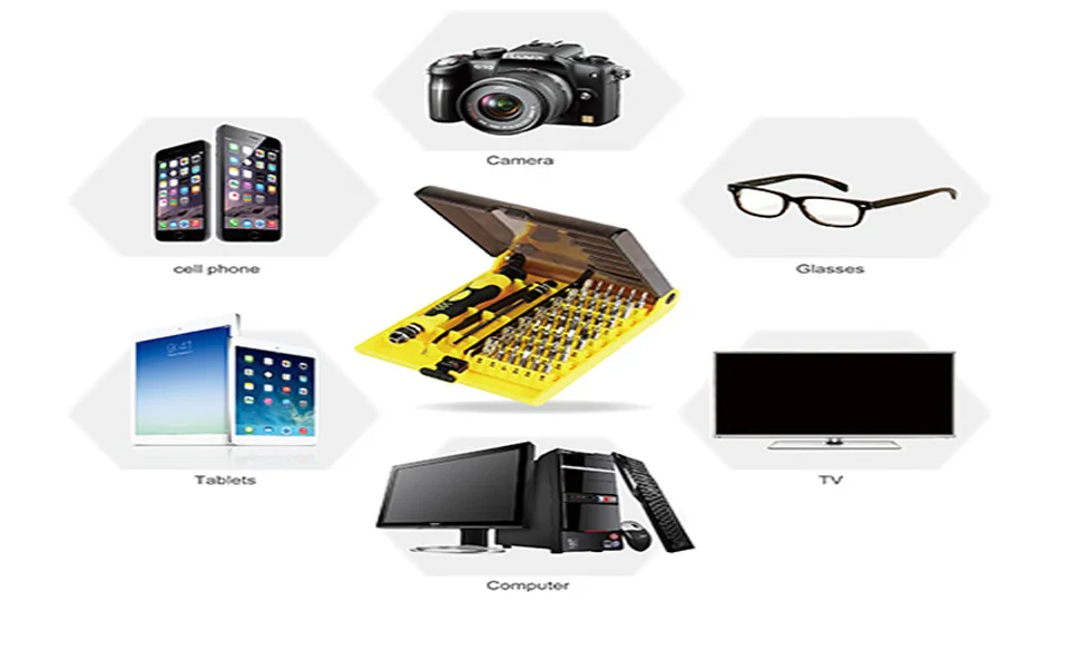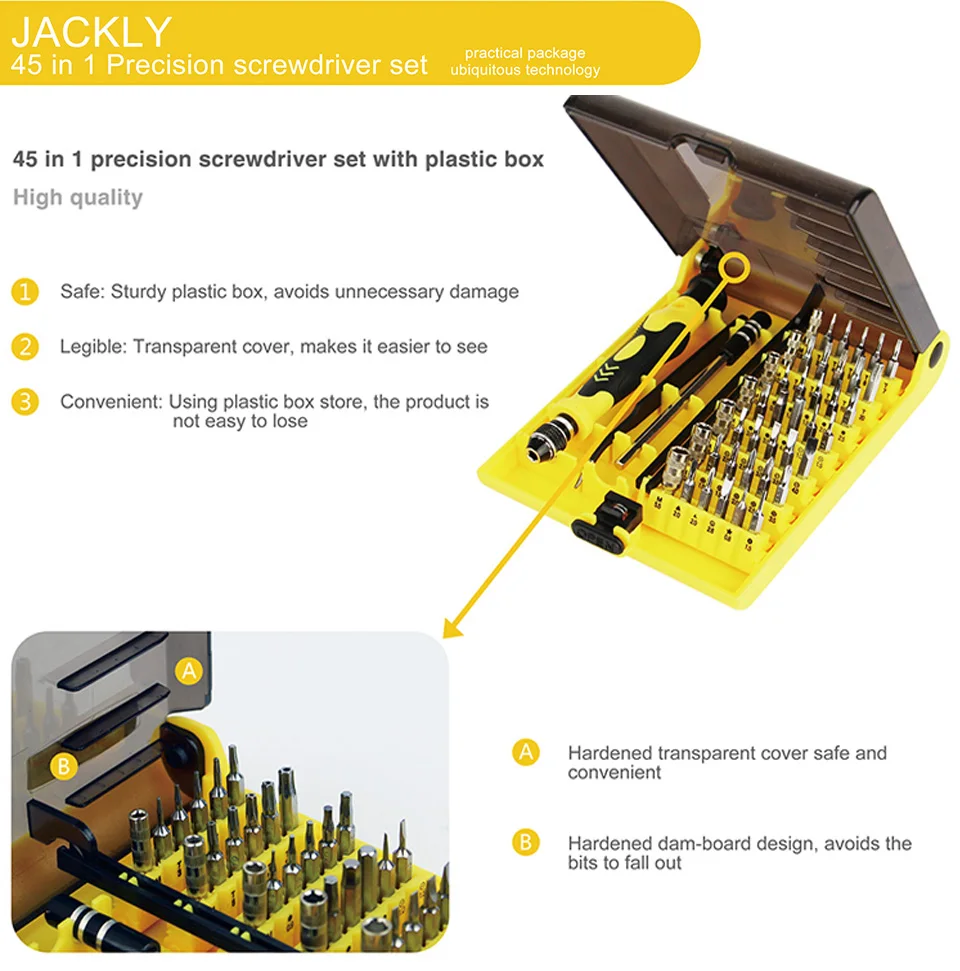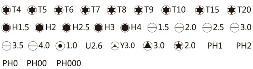 -С поворотной нескользящей ручкой и удлинителем -Магнитная головка партии, эффективно впитывающий винт -Простота в использовании и переноске -Идеально подходит для ремонта ноутбуков, мобильных устройств, подушек, очков, часов, камеры и других электронных устройств 46 в 1 посылка включает в себя: Треугольники: 2,0 мм/3,0 мм Звезда: 0,8 мм/1,2 мм Тип Y: Y0.6/2,0/2,5 U Тип: 2,6 мм Phillips: 1,0/1,5/2,0/3,0 Толщина лезвия: 1,0/1,5/2,0/3,0/4,0 Torx: T2/T3/T4/T5/T6/T8/T9/T10/T15/T20 Шестигранник: H0.9/1,3/1,5/2,0/2,5/3,0/4,0 M: M2.5/3,0/3,5/4,0/4,5/5,0/5,5 1 х ручка 1 х пинцет Удлинитель-1 шт. 1 х пластиковый чехол для хранения