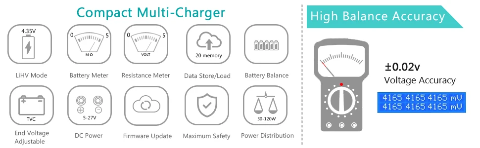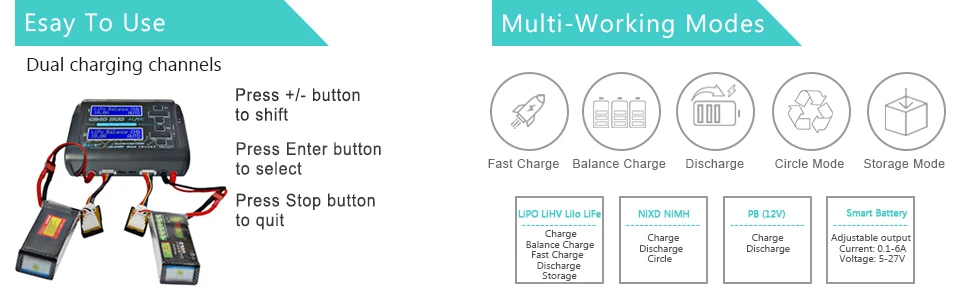 Вход: AC 100-240 В/DC 11-18 вМощность зарядки: режим переменного тока 150 Вт (CH1 + CH2 = 150 Вт), режим постоянного тока 120 Вт * 2 = 240 ВтМощность разряда: макс. 10 Вт * 2Диапазон заряда: 0,1-10A * 2Диапазон тока разряда: 0.1-2A * 2Количество ячеек Lilon/LiPo/LiFe/LiHV: 1-6 ячеек * 2NiCd/NiMH Количество ячеек батареи: 1-15 ячеек * 2PB Напряжение батареи: 2-20 в * 2Умная Батарея: I/II/III * 2Слив тока для балансировки: 500 мА/ячейкаВес нетто: 0,48 кгРазмер: 145*105*64 ммВес брутто: 0,9 кгРазмер посылка: 215*155*75 мм