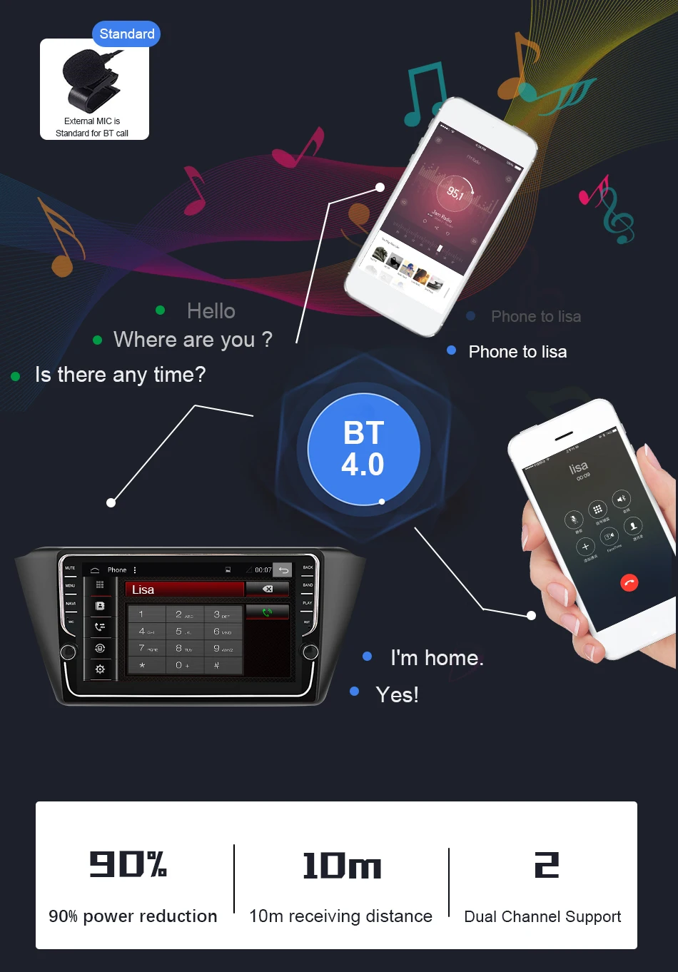 BT 4,0 Сделать вождение намного безопаснее. Двойной BT чипы внутри Поддержка громкой связи BT и потоковой передачи данных