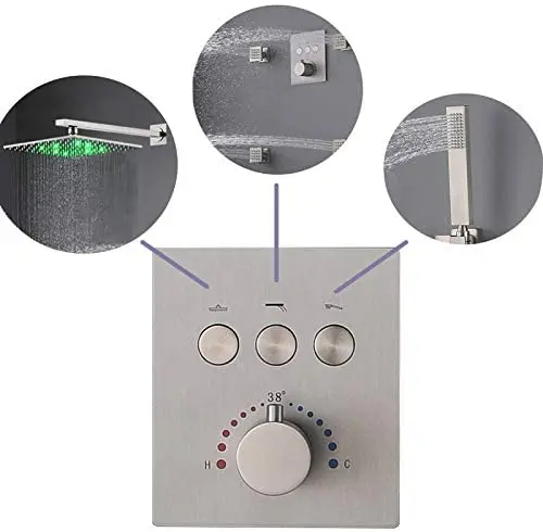 Матовая никелевая отделка полный комплект: включая 12-дюймовый светодиодный душ с квадратной насадкой для дождя (латунь), ручная душевая головка (латунь), 16 дюймов душевая головка (латунь), шланг для душа 59 дюймов (304 0408 нержавеющая сталь), держатель для душа (латунь), регулирующий клапан для душа (латунь). 4 шт. струи тела (латунь). Романтический светодиодный душ: питание от давления воды, не требуется батарея, безопасно для использования. Изменение цвета при температуре воды. (Синий: 32-86 ℉; Зеленый: 86-104 ℉; Красный: 104-122 ℉) Надежный керамический картридж: термостатический дизайн, нет необходимости регулировать температуру почти каждый раз. Простота в эксплуатации: дизайн кнопки обеспечивает легкий поток и контроль температуры. Вы можете переключить кнопку, чтобы открыть насадку для душа, ручную насадку для душа и душевые струи, как вам нравится (можно использовать вместе одновременно). 5 лет гарантии: 100% гарантия: по любой причине вы недовольны этой душевой системой, дайте нам знать, и мы сделаем это правильно, полный возврат денег или бесплатную замену, в зависимости от того, что вы предпочитаете.