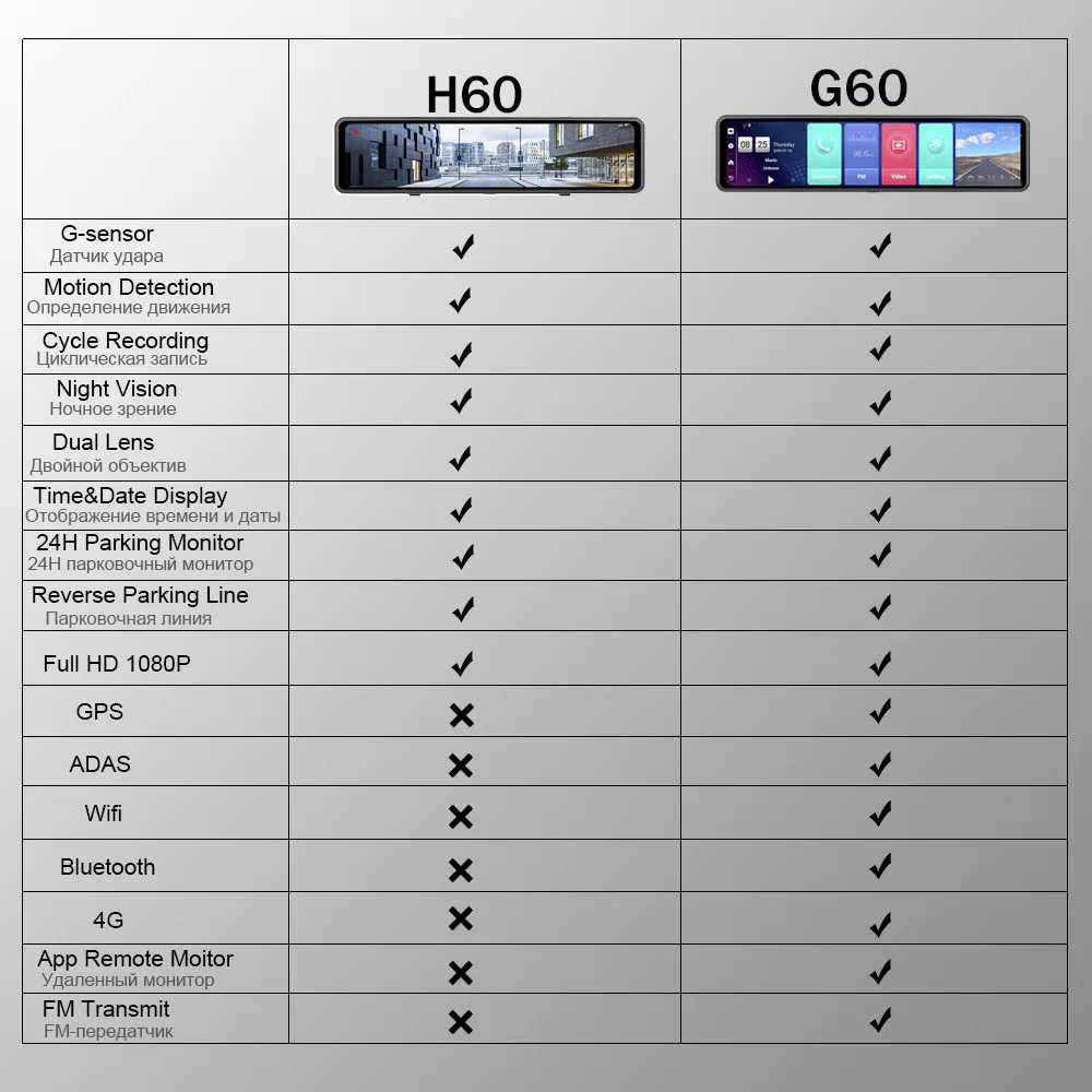 Дневная и Ночная запись, циклическая запись, g-датчик (для H60 и F60)