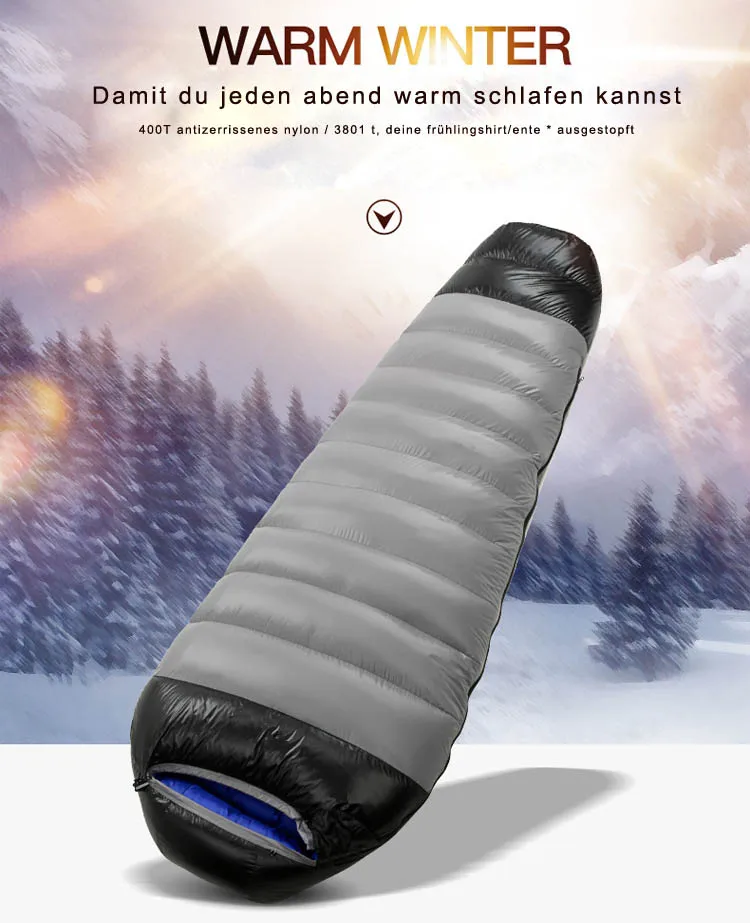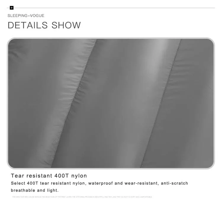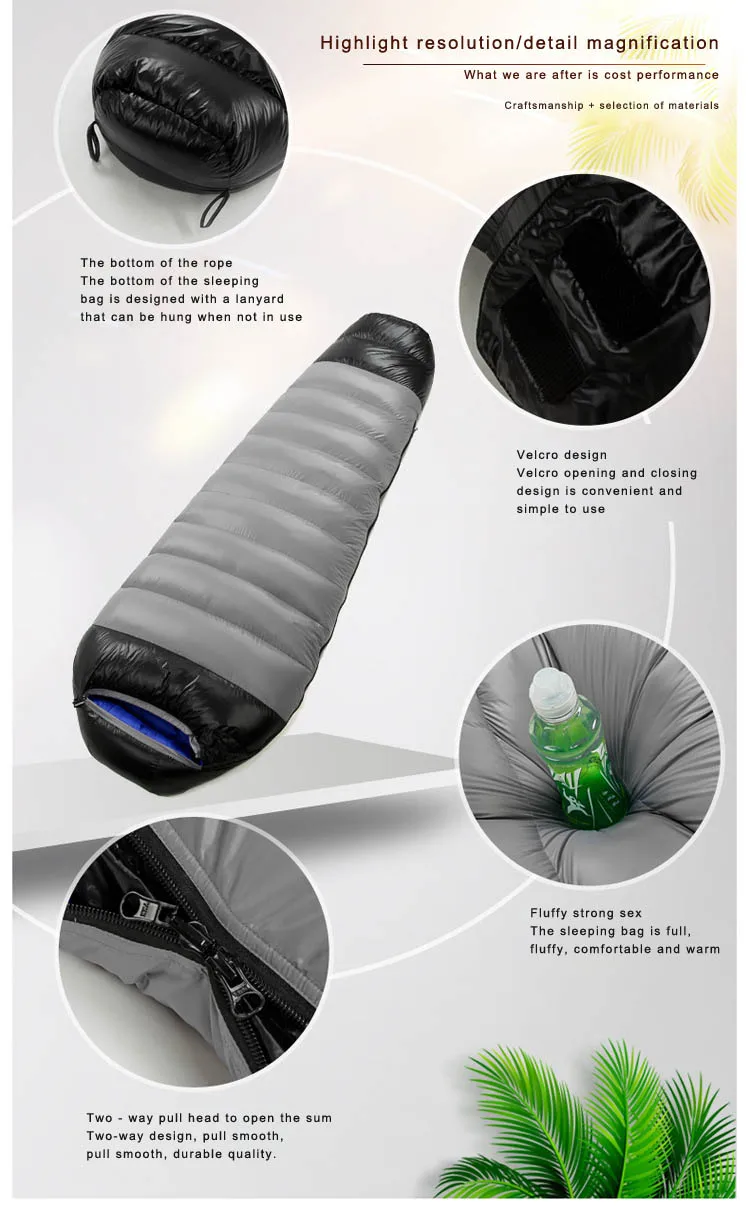 [Specifications]: 210 * 80 * 50 (cm) [Noodles]: 400T, 20D ultra-light nylon (waterproof, tear resistant) [Lining]: 380T, 20D ultra-light nylon (waterproof, tear resistant) [Accessories]: SBS No. 5 rail head zipper, reflective highlight slider, imported non-stick hand Velcro, Danaflex fasteners. [Accessories]: a compression bag Filling: White goose down Color: gray spell blue, gray spell green Features: 1. Vertical-lined mummy-type sleeping bag is small and portable; 2. The fabric is made of ultra-light nylon with no load; 3, down chest collar, down windshield, effectively keep warm; 4. The vertical lining is made of 100% nylon breathable yarn, which is strong and breathable; 5. Zipper guide type slider can be operated inside and outside at will; 6. Every two sleeping bags can be spliced to each other.