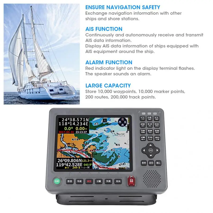 6. Цветной ЖК-дисплей 8,0 дюйма может отображать глобальные таблицы береговой линии, размещать данные о имени, а также Путевые точки, настройки маршрута и дорожки, редактировать и удалять.