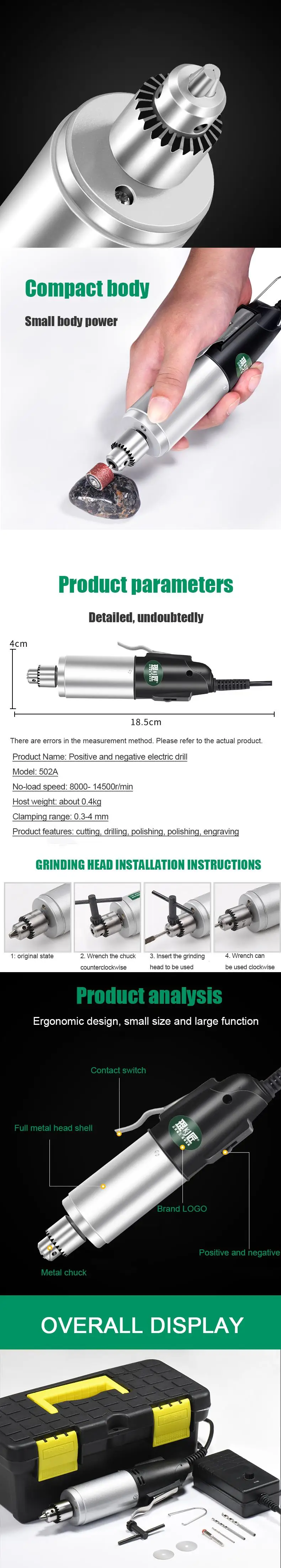 Модель: 502A Вес: 3 кг Размер: 260*150*180 мм Режим питания: постоянный ток Эксплуатация: ручной Скорость без нагрузки: 8000 ~ 14500р/мин Диапазон зажима: 0,3-4 мм Функция продукта: резка/сверление/Шлифовка/полировка/гравировка