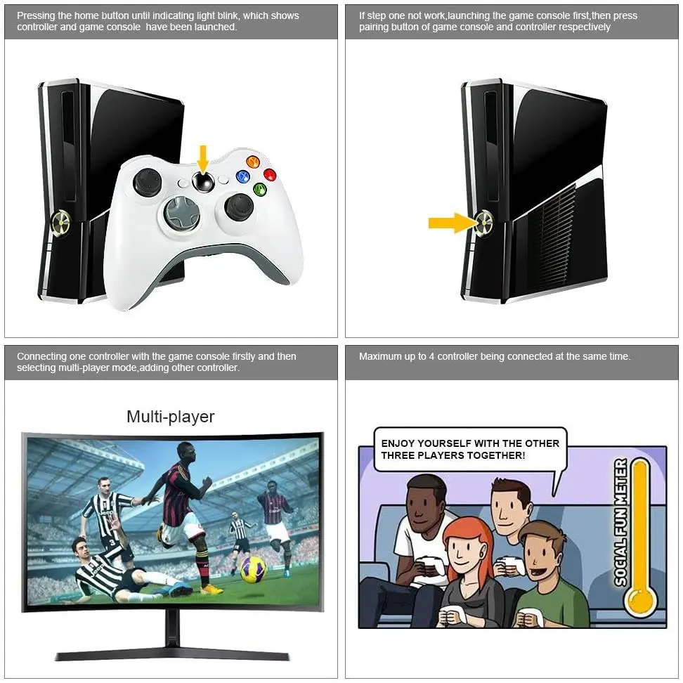 [Wireless] Integrated bluetooth high-performance wireless technology lets you control the action from up to 30 feet away,which means you have more room to move. [Advanced Design] Precise thumb sticks, two pressure-p`oint triggers, and an 8-way directional pad help you stay in control. New left and right shoulder buttons are designed for ease of use.Vibration feedback gives you a riveting gaming experience. Adjustable vibration feedback for longer battery life. [Best Game] Use up to four controllers simultaneously on one console,requires 2 AA batteries or dedicated battery. Integrated headset port for Xbox LIVE play. Use the Xbox 360 Guide button to keep track of your friends, access your games and media, or power on and off your Xbox 360 console. [For PC and Xbox 360] Xbox 360 Controller for Windows works with most Windows 7 and 8 and 10PCs and Xbox 360, delivering a consistent and universal gaming experience. [Ergonomic] Play in total comfort. Great new look with a matte black finish and gloss accents. Award winning compact ergonomics provide a more comfortable gaming experience.