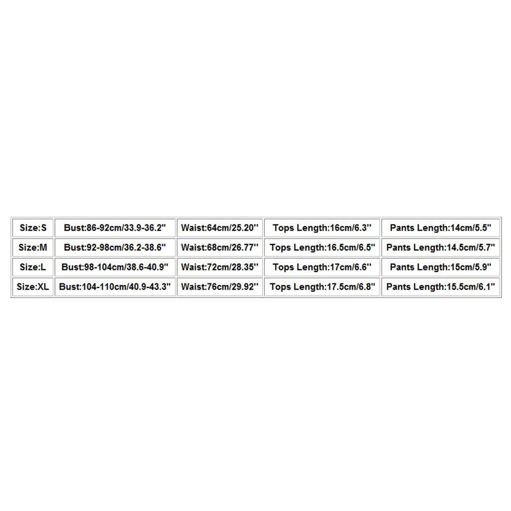 Размер Бюст Талия Длина топа Длина брюк S 86-92 см/33,9-36,2" 64 см/25,20'' 16 см/6,3 дюйма 14 см/5,5 дюйма М 92-98 см/36,2-38,6" 68 см/26,77'' 16,5 см/6,5 дюйма 14,5 см/5,7 дюйма L 98-104 см/38,6-40,9" 72 см/28,35'' 17 см/6,6'' 15 см/5,9 дюйма XL 104-110 см/40,9-43,3" 76 см/29,92'' 17,5 см/6,8 дюйма 15,5 см/6,1 дюйма
