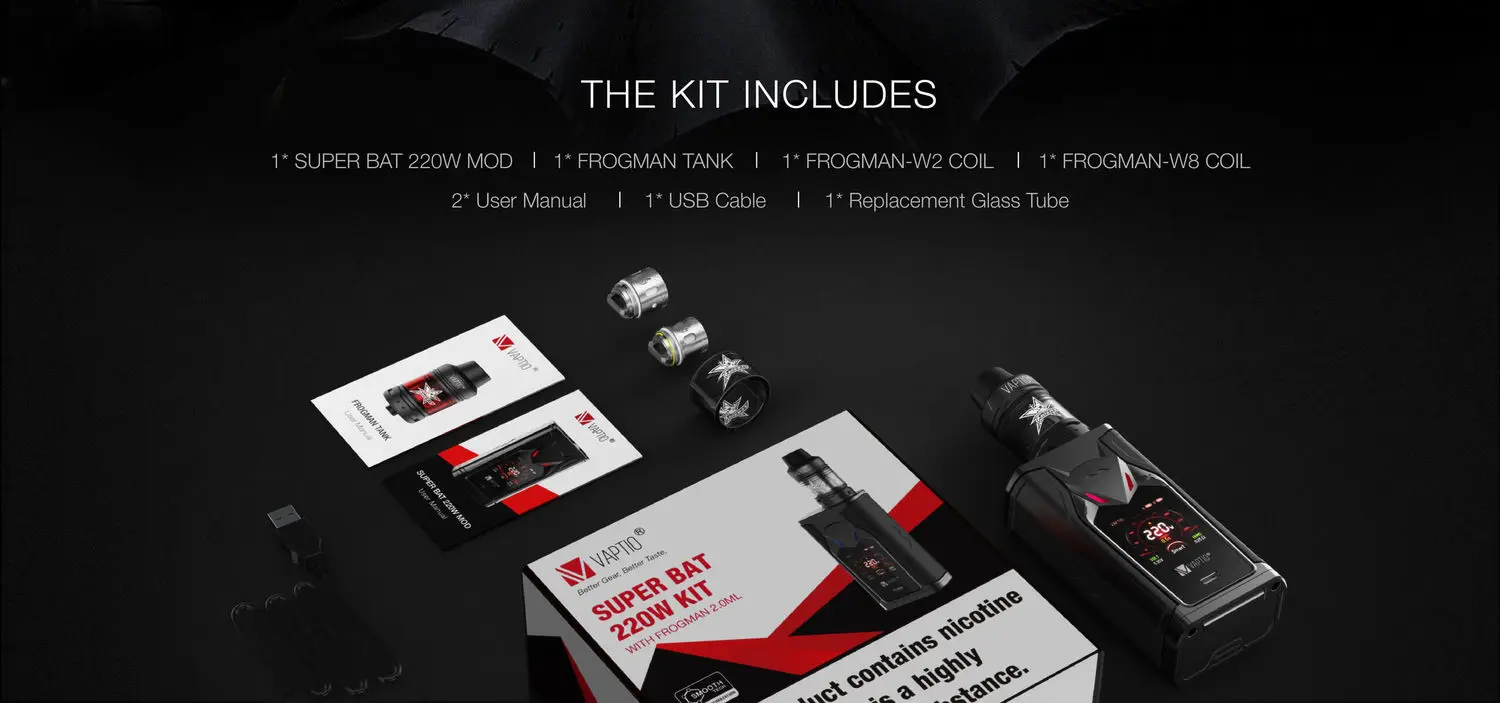 • Мод Super Bat 220 Вт, 1 шт. • 1 бак для фрогмана • 1 Катушка Frogman W2 • 1 Катушка Frogman W8 • 1 сменная стеклянная трубка • 1 usb-кабель • 2 шт., руководство пользователя Примечание: 2 батарейки 18650 в комплект не входят