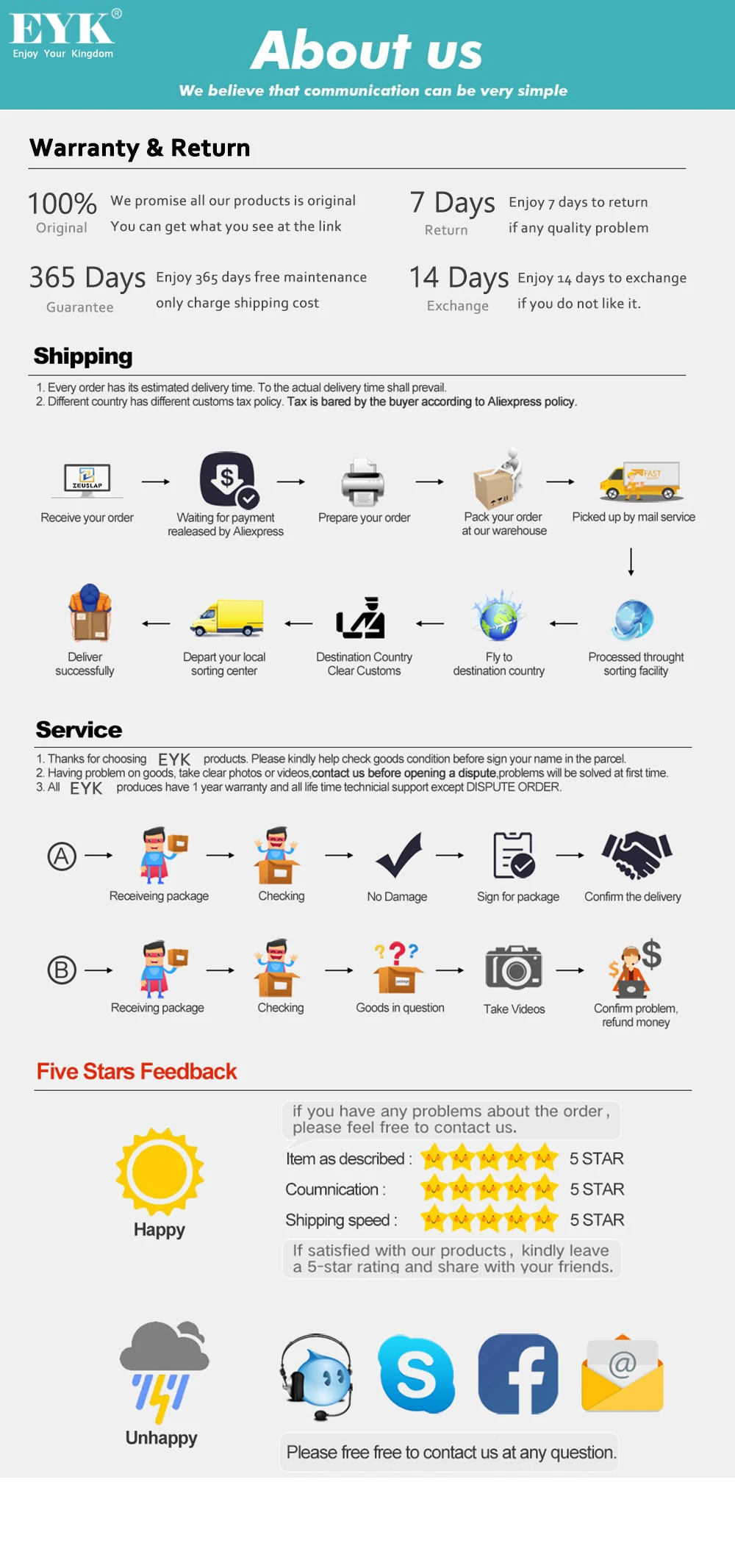 1. У нас есть четыре варианта адаптера питания: 1) штепсельная вилка европейского стандарта 2) штепсельная вилка стандарта США 3) штепсельная вилка стандарта Великобритании 4) штепсельная вилка AU 2. Пожалуйста, подтвердите частоту для вас. Если вам нужна другая частота, пожалуйста, сообщите нам перед заказом.