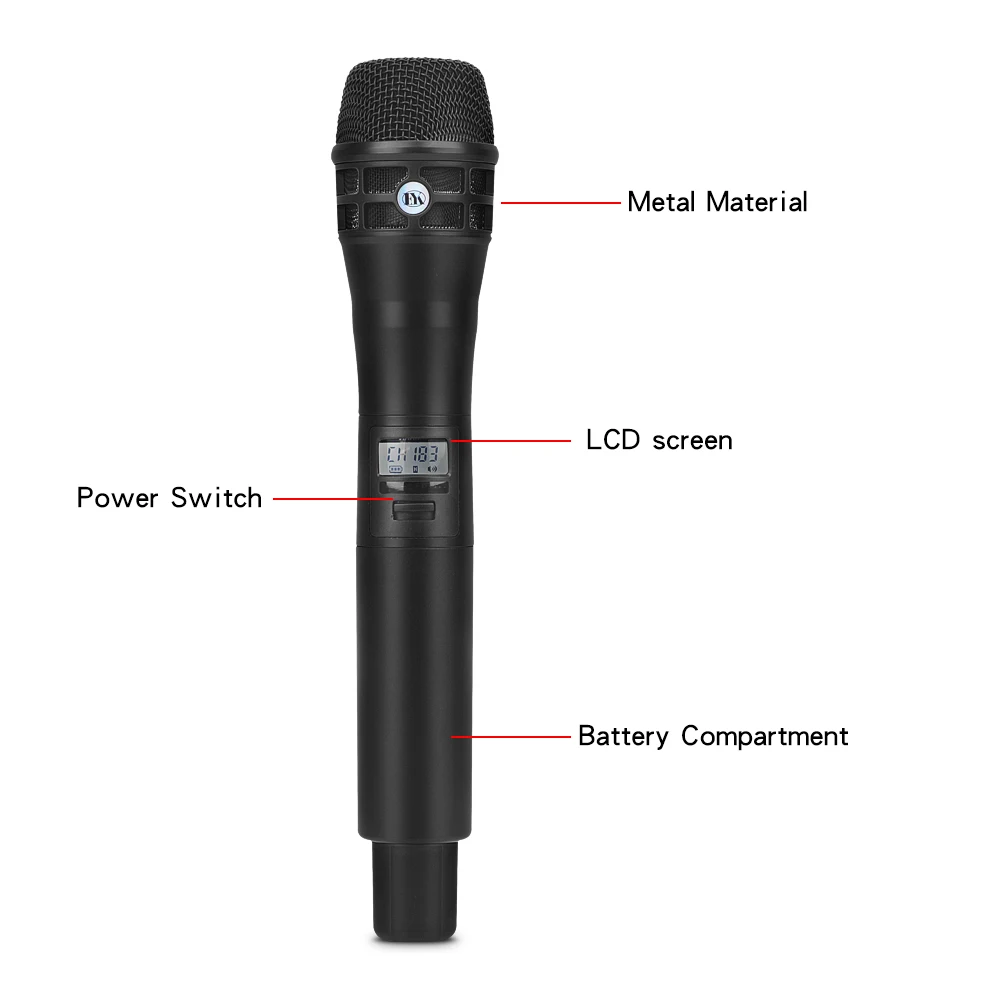 1. Материал: пластиковый ручной микрофон (металлическая головка и пластиковый корпус) 2. Картридж: Высокочувствительный микрофонный сердечник 1) Тип: Динамический 2) Полярный узор: кардиоид 3. Рабочий ЖК-экран: Отображение статуса 1) канал 2) мощность аккумулятора 3) Высокая мощность передачи 4) аудиовыход частоты 4. Выключатель питания: конструкция переключателя 5. Батарея отсек: 2*1,5 V AA Батарея в соответствии со спросом (не прилагаются)