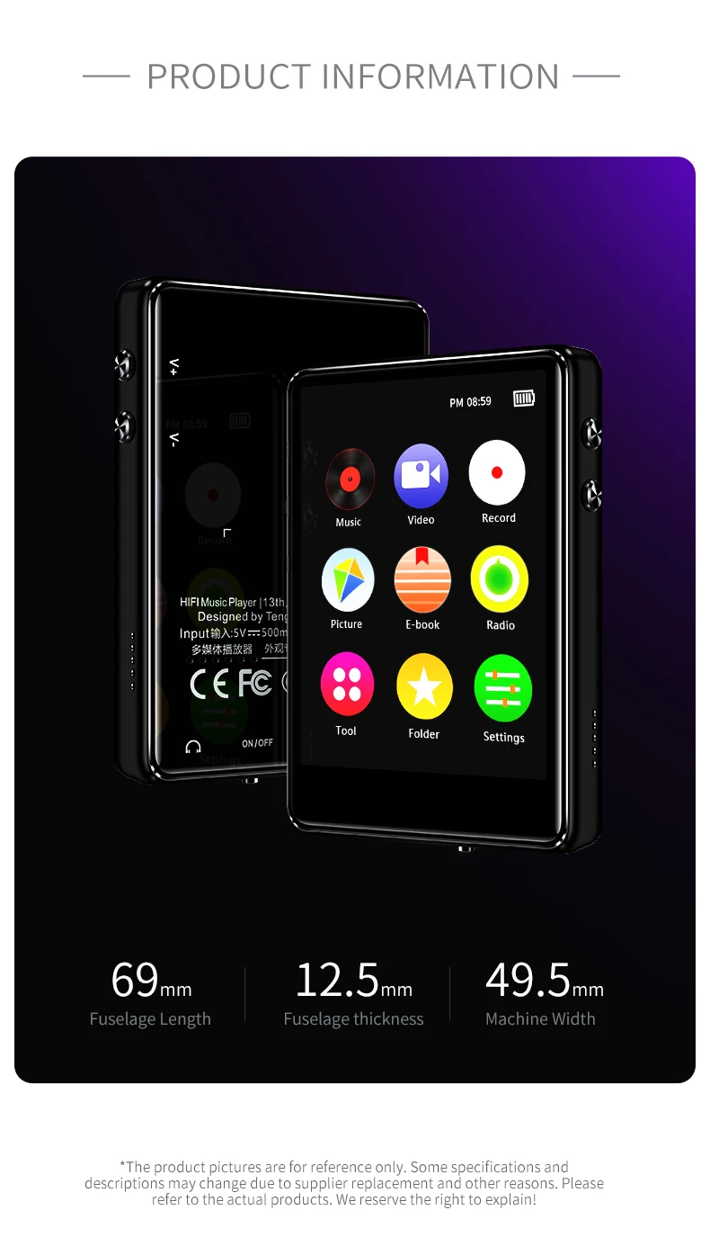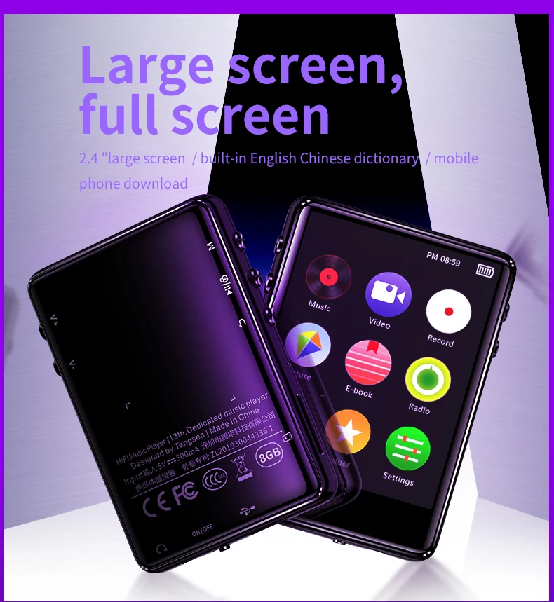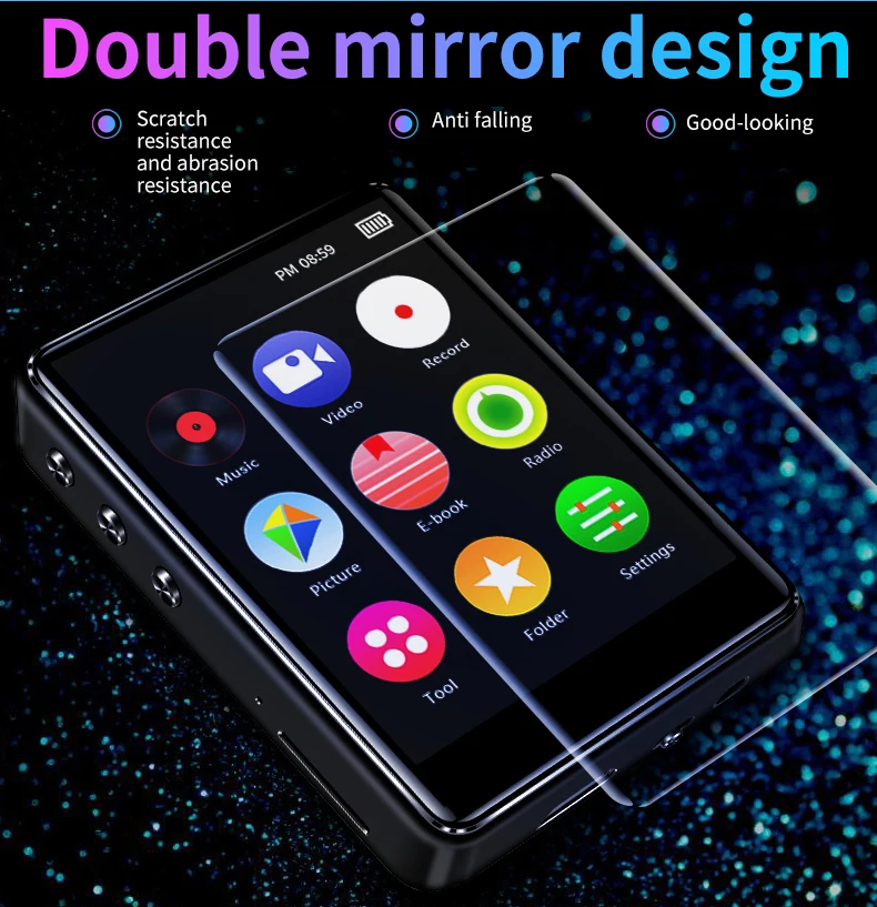 Bluetooth 4.2 Support for 128GB TF Card Expansion Commodity type: HIFI MP4 MUSIC Player Storage medium:8GB/16GB operation mode: Capacitance touch transmission interface: Micro usb (2.0) Headphone jack: Dual earphone interface Screen size:2.4 inch TFT(240*360 Resolving power) Audio format:MP3/WMA/OGG/APE/FLAC/WAV/AAC-LC Vioeo format:AMV/AVI Picture format:JPEG/BMP/GIF E-book format:TXT Recording format:WAV/MP3 Voice search platform:Automatic search platform/manual search platform Working temperature:-5℃~40℃ Shape Size:69*49.5*12.5mm Net weight:79.5g Shell Material:Magnesium aluminum alloy