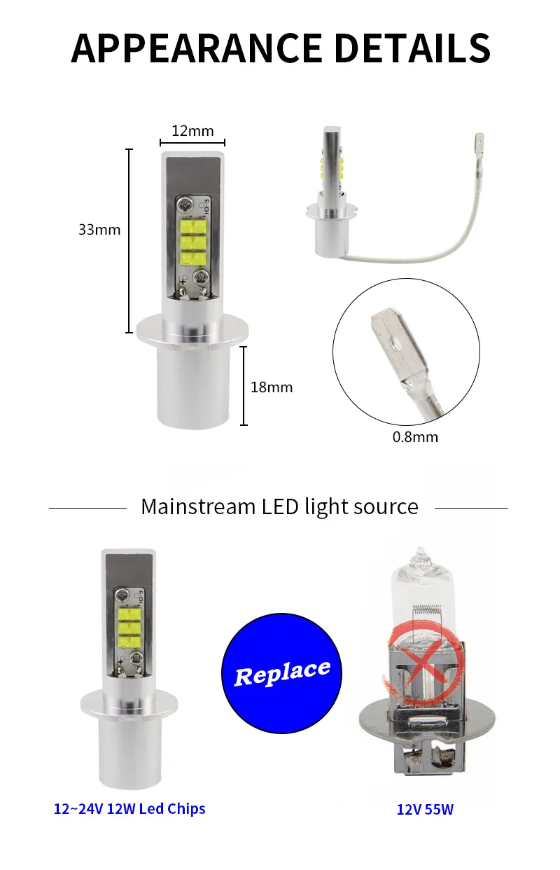 【Наименование model】: ZSH3-12L 【Power】 power: 12 Вт 【Световой поток: 800 лм (белый) 【Световое покрытие 】: без чехла 【LEDs】:SMD2525 12 светодиодов 【Ra】:≥ 80 【Voltage】: 10-30VDC 【Base】: H3 【Светодиодный срок службы: 30000 часов 【Цвет светодиодов: белый/теплый белый 【Размер лампы 】: см. Размерный рисунок.