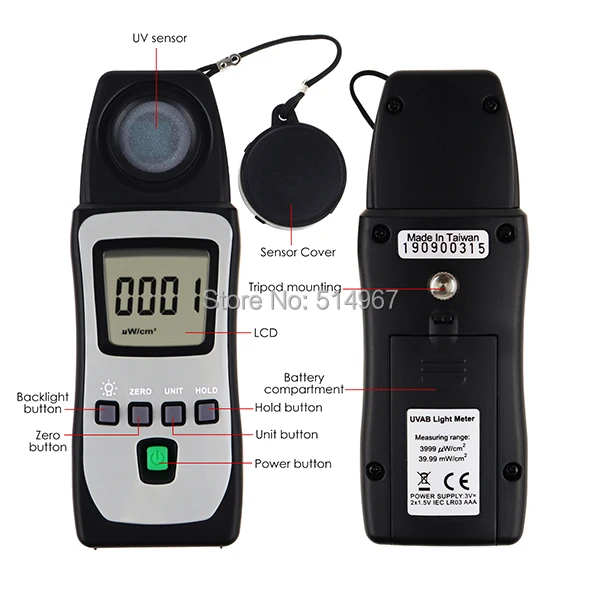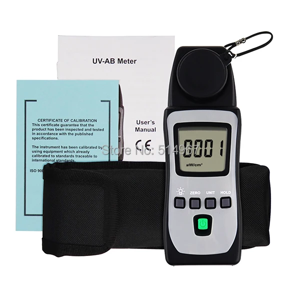 Профессиональный, высококачественный УФ-метр С защитой от УФ-излучения для измерения ультрафиолетовым излучением УФ-детектор спектра от 290нм до 390нм Нулевая кнопка Переключаемый измерительный блок Функция удержания данных Индикатор низкого заряда батареи Функция включения/выключения подсветки Микропроцессорная схема обеспечивает высокую надежность и долговечность Легко читаемый ЖК-дисплей Дисплей перегрузки Автоматическая или ручная функция включения/выключения EMC: этот инструмент совместим с EMC и прошел испытания на совместимость в соответствии с EN61326 (1997) + A1 (1998) + A2 (2001).