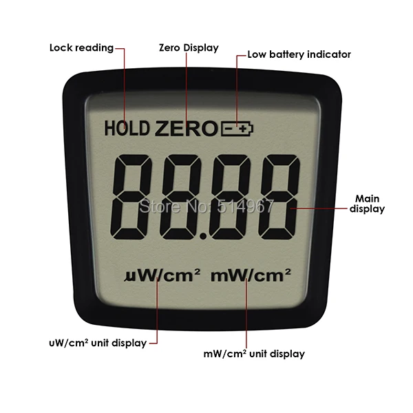 Дисплей: 3 3/4 цифр LCD с 4000 макс. считыванием Единица: uWcm2, mW/cm2 Диапазон: 3999 uW/cm2 ~ 39,99 mW/cm2 (1000 uW/cm2 = 1 mW/cm2) Диапазон частот УФ-датчика: 290 ~ 390 nmточность: (± 4% FS + 2dg) FS: полная Масштабирование 15%: Ультрафиолетовый Солнечный свет Длина волны пиковой чувствительности: 365 нм Примерное время образца. 3 сек. Точность: <± 3/год Рабочая среда: 5 ~ 40 °C (41 ~ 104 °F), ниже 80% относительной влажности Среда хранения: -10 ~ 60 °C (14 ~ 140 °F), ниже 70% RH Срок службы батареи: около 50 часов Размер: прибл. 133x48x27 мм Вес: около 90 ГМС