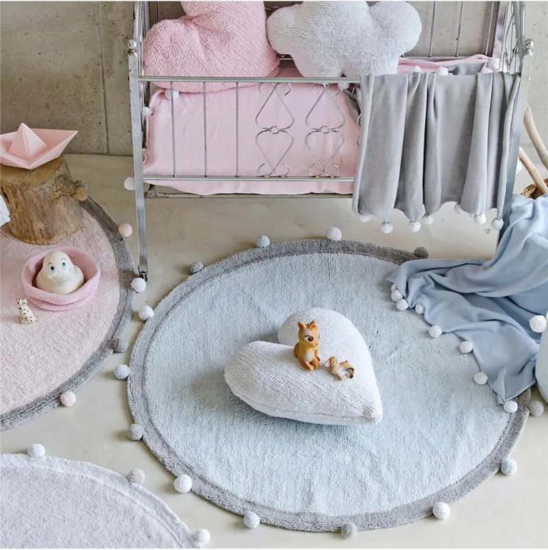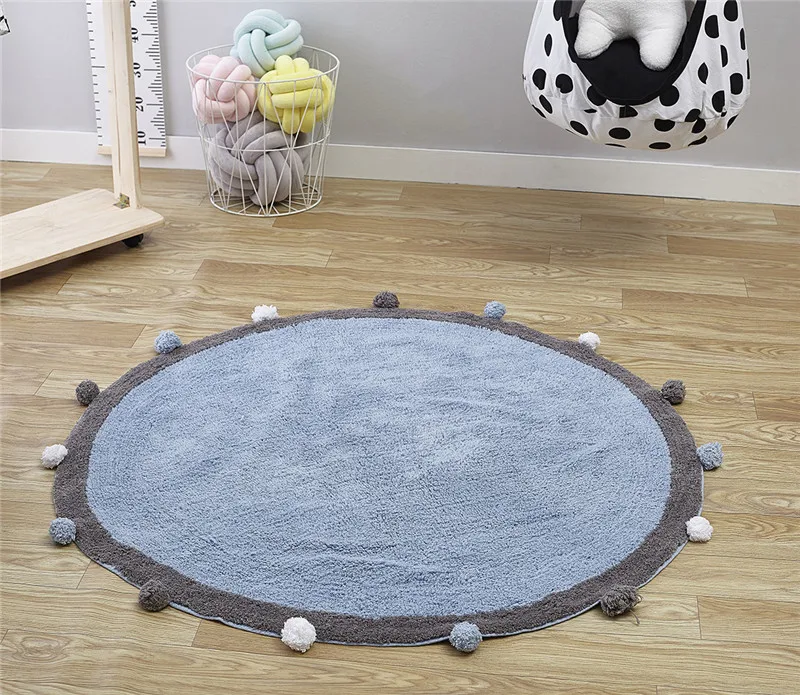 Детский игровой коврик, мультяшный детский коврик для ползания, круглый коврик, мягкий удобный коврик, круглый детский коврик, украшение для детской комнаты Нескользящая Диаметр: 120 см/47,24 дюйма Диаметр шарика для волос: 4 см/1,57 дюйма Вес: 1,8 кг Материал: шарик для волос, хлопковая нить Три цвета
