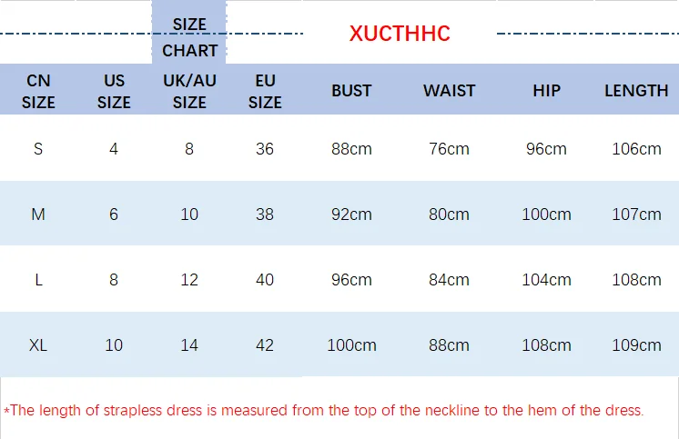 *The length of strapless dress is measured from the top of the neckline to the hem of the dress. *One or two inches error could be possible within the measurements. *Every dress has a unique size chart,please compare your measurement to the measurements provided in the size chart.And do not measure with clothing except undergarments.