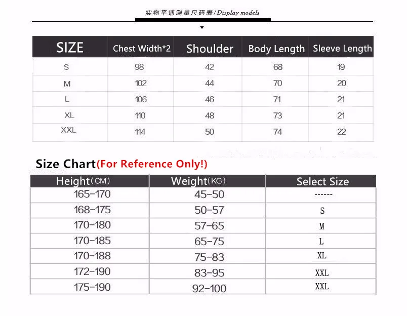 Грудь (дюймы) : S = 38 ; M = 40 ; L = 41 ; XL = 43; XXL = 46