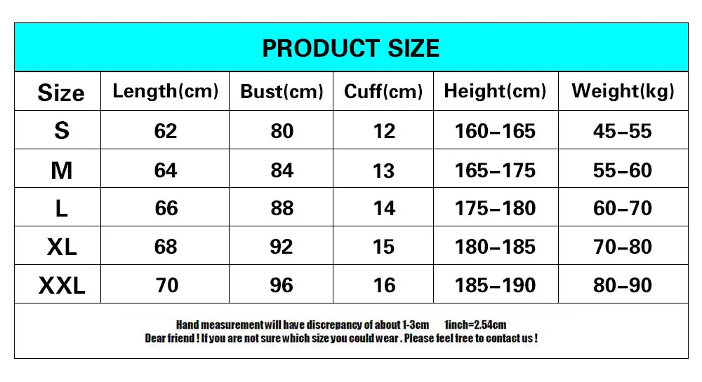 S: подходит для роста 160-165 см, вес 45-55 кг M: подходит для роста 165-175 см, вес 55-60 кг L: подходит для роста 175-180 см, вес 60-70 кг XL: подходит для роста 180-185 см, вес 70-80 кг Xxl: подходит для роста 185-190 см, вес 80-90 кг