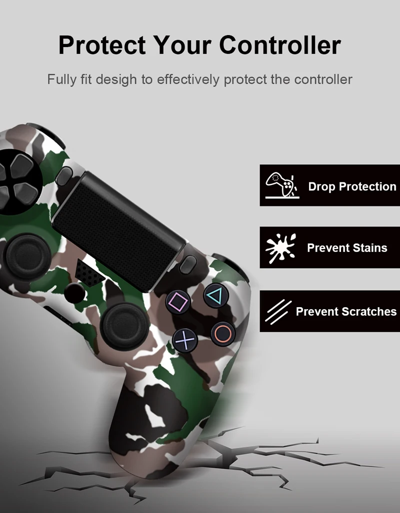 Предотвращает любые повреждения контроллера PS4 от ударов, царапин. Силиконовое трение обеспечивает удобный захват, предотвращает скольжение во время игры, больше не беспокойтесь о потных руках. Очень легко устанавливается и удаляется, идеально подходит для контроллера PS4, не влияет на какую-либо функцию. Технология водопередачи, камуфляжная печать на контроллере PS4, более модная.