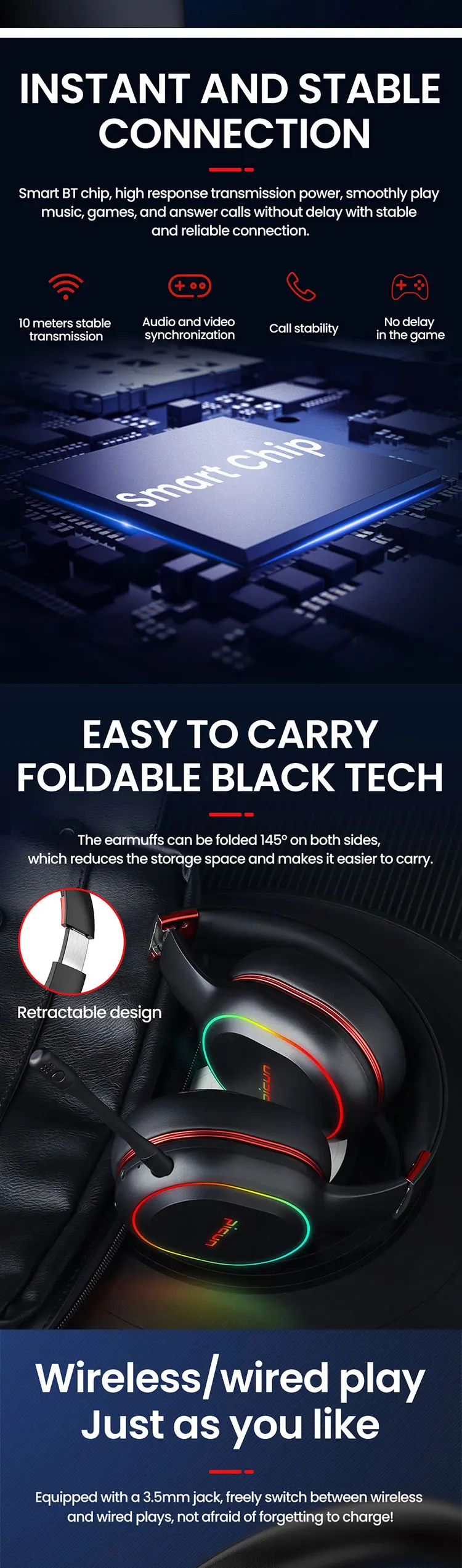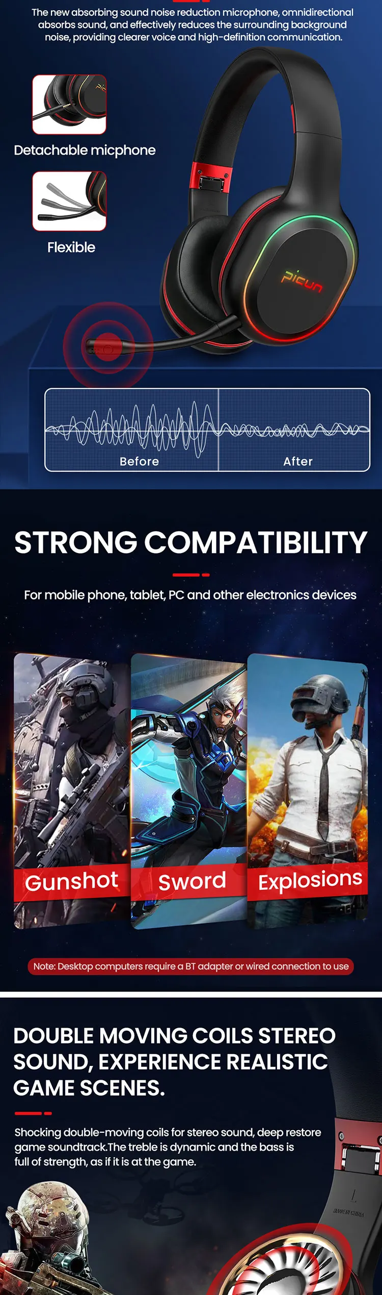 Новейшие Picun P80S мобильные Игровые наушники светодиодный RGB Вибрация игровая Bluetooth гарнитура съемный микрофон беспроводные/проводные наушники
