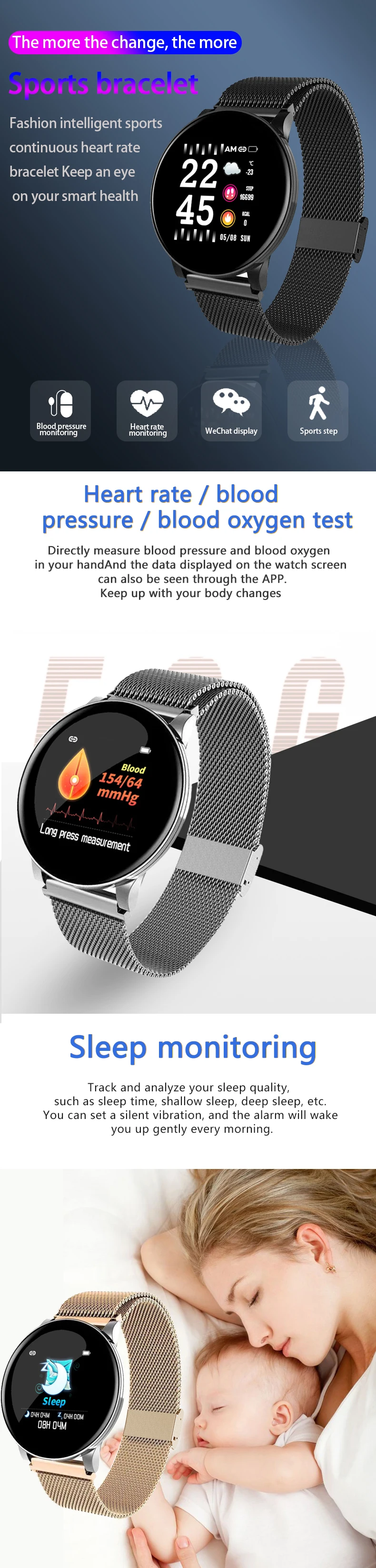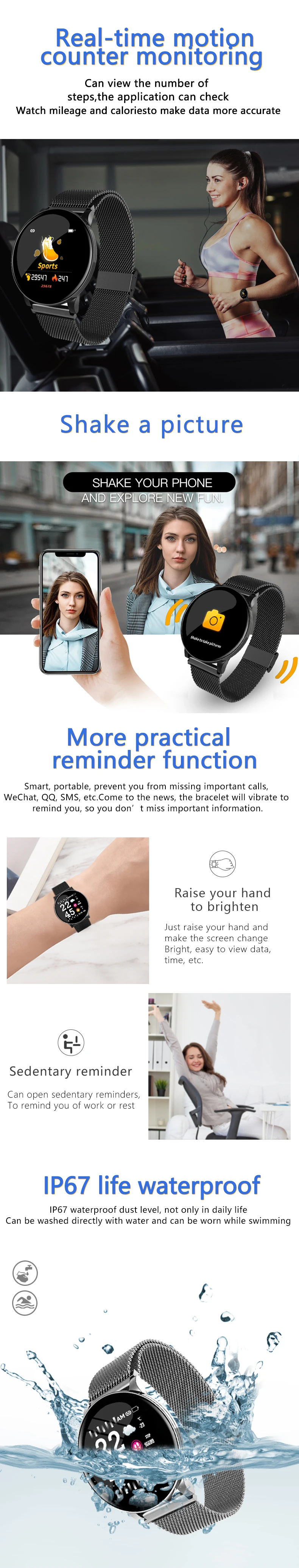 Водонепроницаемый IP67 Поддержка пульсометра Поддержка монитора артериального давления Поддержка монитора кислорода в крови Поддержка монитора сна Поддержка мультиспортивных режимов Поддержка напоминаний о звонках или сообщениях Поддержка отклонения вызова Уведомления поддерживают Facebook,Twitter,Wechat, WhatsApp и т. Д. Вибросигнал Поддержка экрана с автоматическим подсветкой Секундомер/ Другие функции поддерживают шагомер, будильник, календарь, напоминание о сидячем положении, дистанционное управление камерой, защита от потери Технические параметры Датчик G-Sensor, датчик сердечного ритма Размер экрана: 1,3 дюйма Тип: TFT Разрешение: 240*240 пикселей Емкость аккумулятора: 170 мАч Время ожидания: около 15 дней Время использования: около 5 дней Время зарядки: около 2 часов Тип зарядки: зажим для зарядки