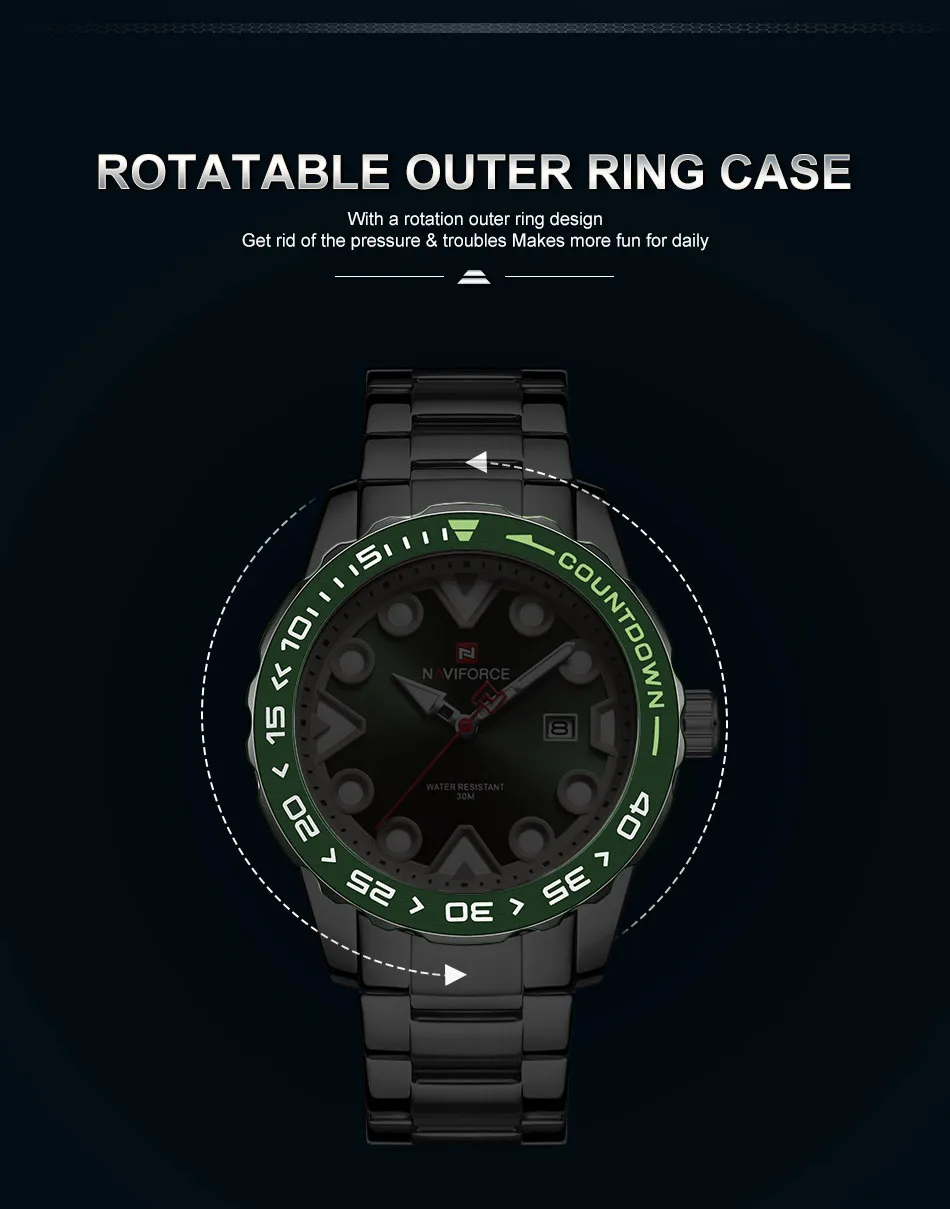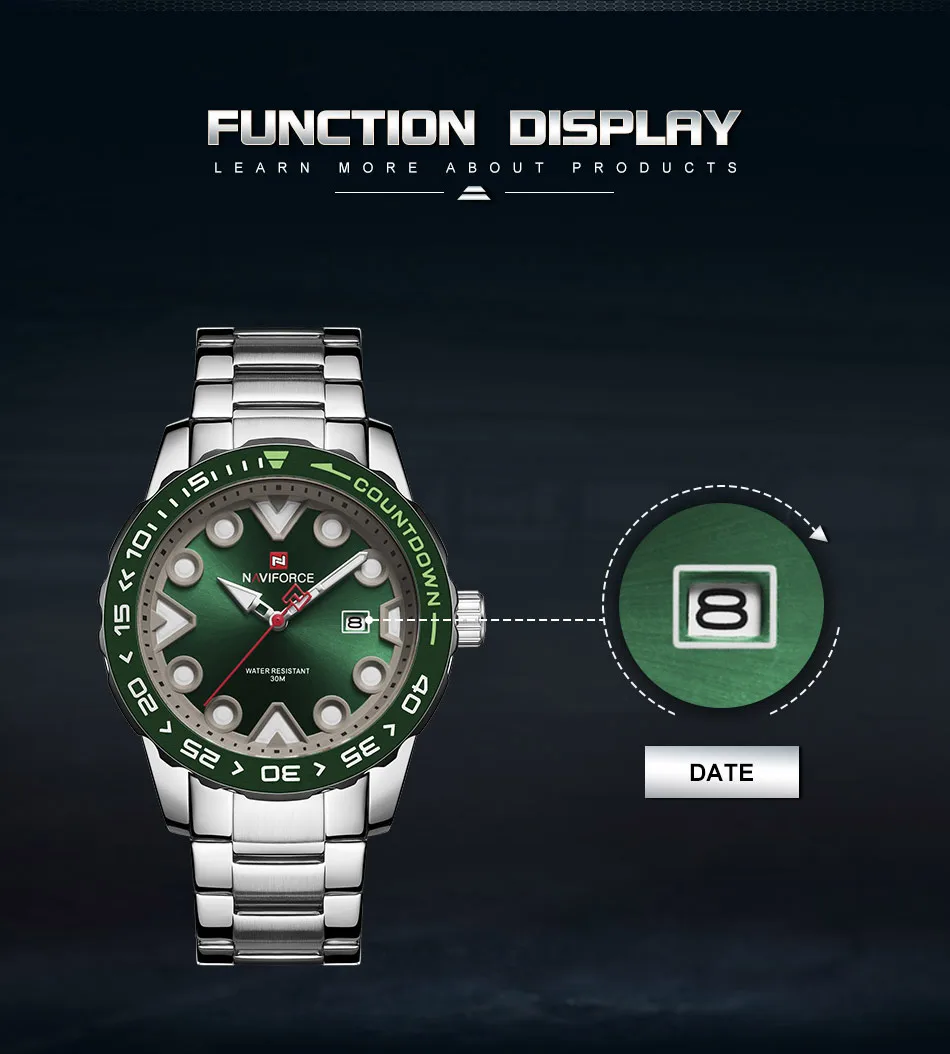 Описание 100% Новый оригинал и высокое качество Отображение даты и времени Браслет из нержавеющей стали Светящиеся стрелки 30 м водонагреватель Технические характеристики Материал корпуса: сплав Чехол Диаметр: 44,5 мм Чехол Толщина: 12,5 мм Материал ремешка: нержавеющая сталь Длина ремешка (включая чехол): 245 мм Ширина ремешка: 23 мм Вес изделия: 143 г Что входит в комплект 100% новый бренд NAVIFORCE 1 х NAVIFORCE модные повседневные Кварцевые Мужские Оригинальные часы