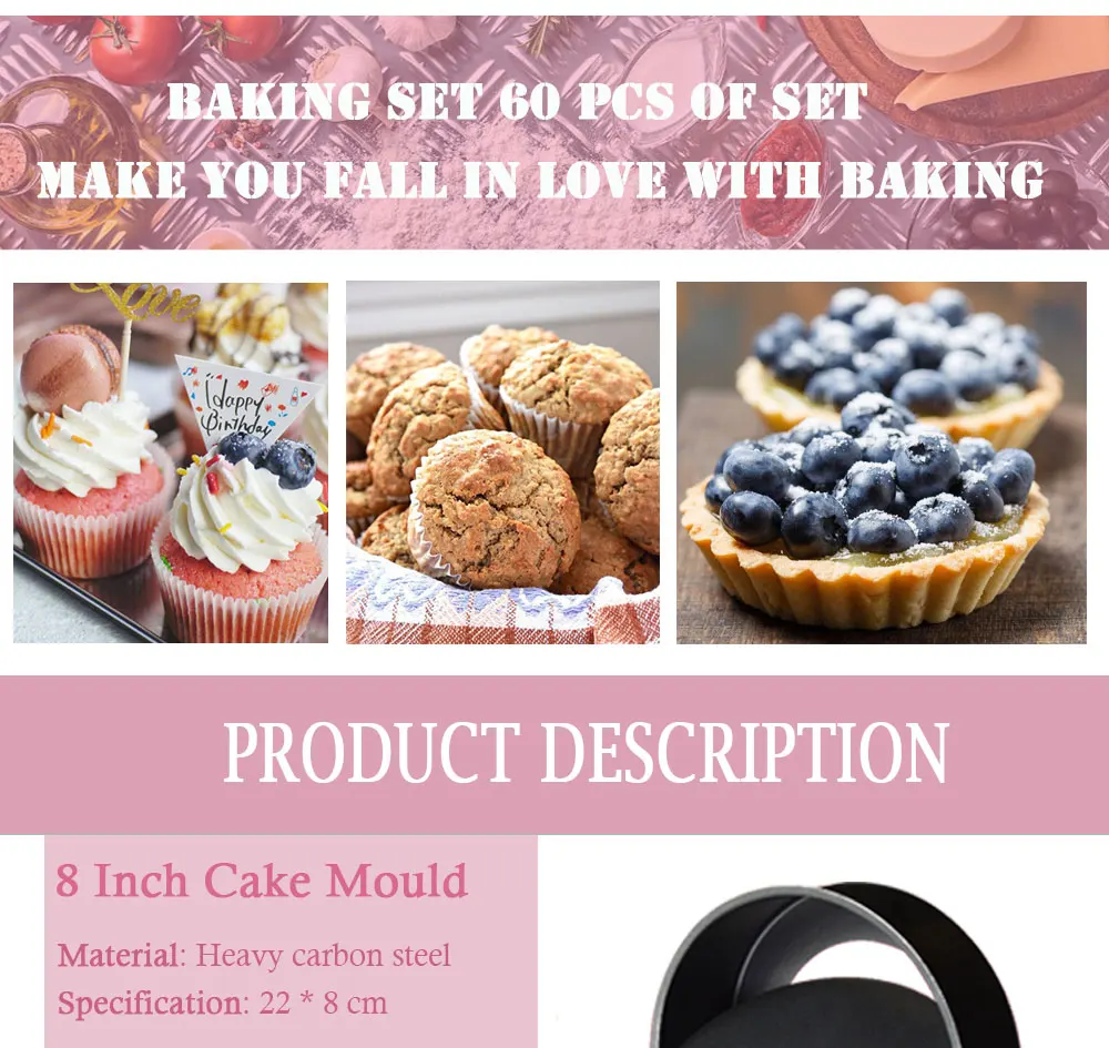 【 60 шт. набор для выпечки: включает в себя❣8,3 "круглая разъемная форма для торта,❣8,6 "& 6,7" круглые противни для тортов с подвижным дном,❣2 заварных противни для пирога,❣2 пирожных кастрюли для кексов,❣Силиконовый кондитерский коврик для выпечки,❣5 мерных стаканчиков,❣5 мерных ложек,❣Силиконовый венчик,❣2 силиконовых шпателя,❣Силиконовый шпатель с прорезями,❣Силиконовая щетка для протирания,❣24 наконечника для глазури из нержавеющей стали,❣1 конвертер кончика глазури,❣3 скрепера,❣10 одноразовых пакетов. Это хороший набор для вас, чтобы сделать различные пирожные, кондитерские изделия и пироги.