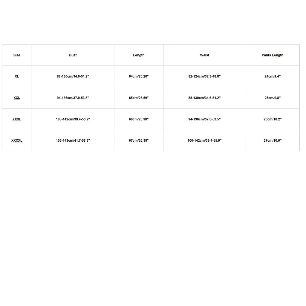 Размер Бюст Длина Талия Длина брюк XL 88-130 см/34,6-51,2" 64 см/25,20'' 82-124 см/32,3-48,8" 24 см/9,4 дюйма XXL 94-136 см/37,0-53,5" 65 см/25,59'' 88-130 см/34,6-51,2" 25 см/9,8 дюйма XХХL 100-142 см/39,4-55,9" 66 см/25,98'' 94-136 см/37,0-53,5" 26 см/10,2 дюйма XXXXL 106-148 см/41,7-58,3" 67 см/26,38'' 100-142 см/39,4-55,9" 27 см/10,6"