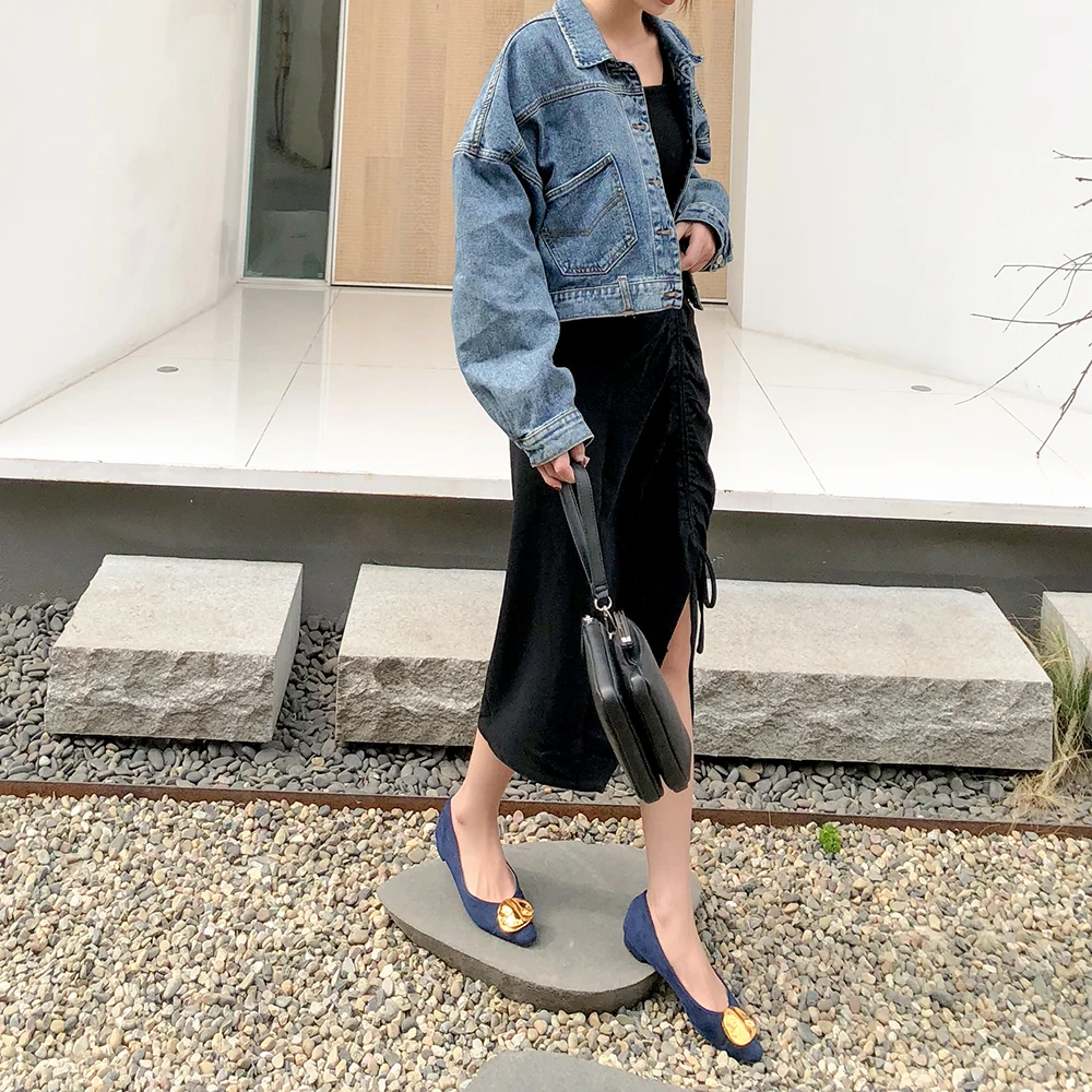 2020 Spring New Women Genuine Leather Flats Shoes Metal Decoration Loafers Women Casual Shoes Round Toe Black Blue Size 34-39