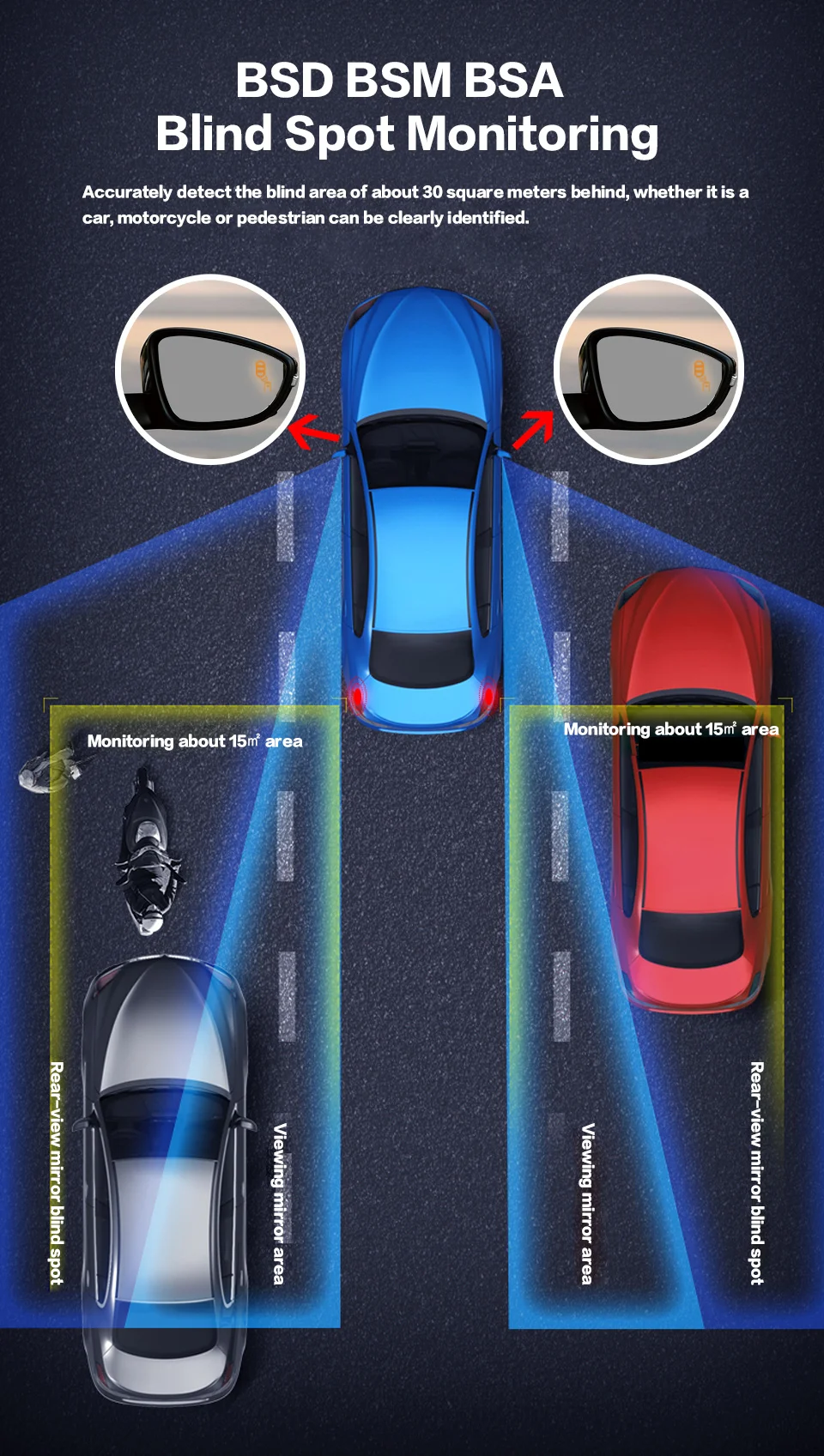 4. В задней части транспортного средства есть слепая зона, которая легко подвергает опасности безопасность вождения.! Когда вы вставляете светодиодный BSM в вашу прекрасную машину, независимо от того, что это день, ночь или даже снег, вы может быть предупреждены в тех случаях, когда есть движущегося объекта поп в задней части автомобиля, с помощью светодиодный освещение на солнечной, мигание, Звуковой сигнал, чтобы водитель мог быть осторожным при смене полосы движения, чтобы избежать возможности бокового аварии.