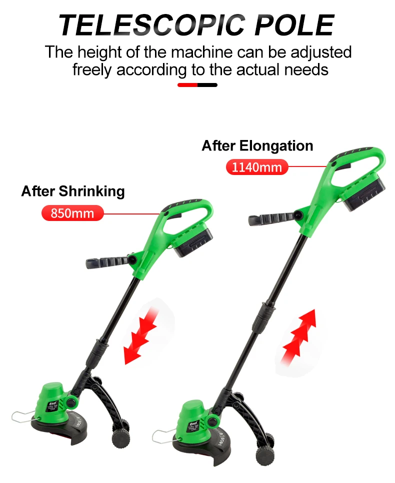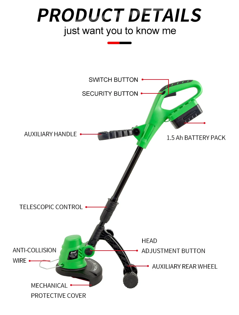 Батарея пакет напряжение: DC 18В Батарея: 1500ма. Ч, литиевая Скорость без нагрузки: 8000 (об/мин) Автомат для резки путь: 230 мм, Время зарядки: 4 часа Телескопическая ручка: алюминий (850-1140 мм) Регулируемая передняя рукоятка Режущая головка может быть отрегулировано к другим углом.(+ 90 °-90 °,180 °) Двойной рукой Безопасность переключатель
