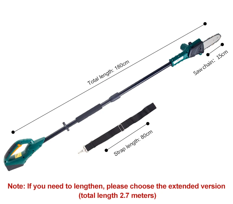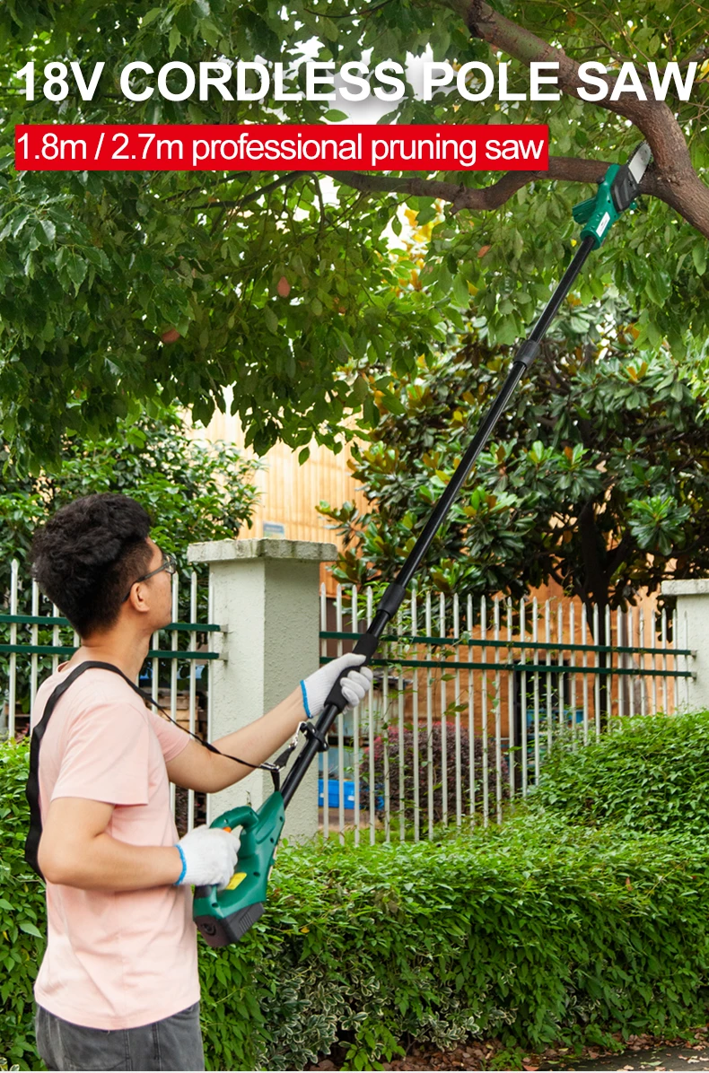 Название: 18V беспроводные полюс пила Бренд: East Фабричный Код: ET2901 Длина резки: 150 мм Чистая Вес: 3,2 кг Число оборотов холостого хода: 2,8 м/с Батарея: 1300 мАч литиевая батарея Время зарядки: 4 ч (при полной зарядке, устойчивая работа около 15 мин) Номинальное напряжение: 18 В постоянного тока Размер: Стандарт (общая длина 180 см, лезвие 15 см) Расширенный (общая длина 270 см лезвие 15 см)